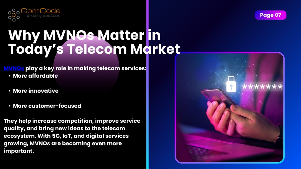 Page 07 • Why MVNOs Matter in Today’s Telecom Market • MVNOs play a key role in making telecom services: • More affordable • More innovative • More customer-focused • They help increase competition, improve service quality, and bring new ideas to the telecom ecosystem. With 5G, IoT, and digital services growing, MVNOs are becoming even more important.