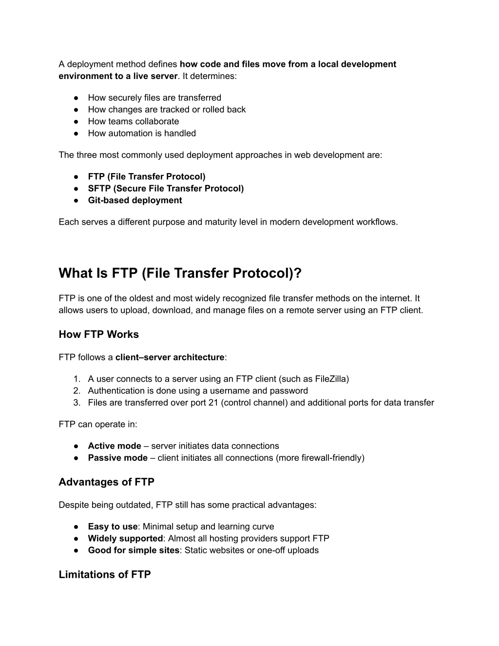 A deployment method defines how code and files move from a local development environment to a live server. It determines: ● How securely files are transferred ● How changes are tracked or rolled back ● How teams collaborate ● How automation is handled The three most commonly used deployment approaches in web development are: ● FTP (File Transfer Protocol) ● SFTP (Secure File Transfer Protocol) ● Git-based deployment Each serves a different purpose and maturity level in modern development workflows. What Is FTP (File Transfer Protocol)? FTP is one of the oldest and most widely recognized file transfer methods on the internet. It allows users to upload, download, and manage files on a remote server using an FTP client. How FTP Works FTP follows a client–server architecture: 1. A user connects to a server using an FTP client (such as FileZilla) 2. Authentication is done using a username and password 3. Files are transferred over port 21 (control channel) and additional ports for data transfer FTP can operate in: ● Active mode – server initiates data connections ● Passive mode – client initiates all connections (more firewall-friendly) Advantages of FTP Despite being outdated, FTP still has some practical advantages: ● Easy to use: Minimal setup and learning curve ● Widely supported: Almost all hosting providers support FTP ● Good for simple sites: Static websites or one-off uploads Limitations of FTP