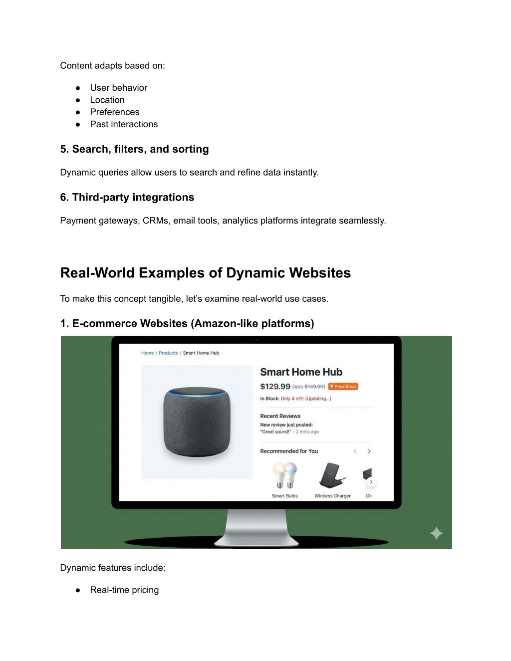 Content adapts based on: ● User behavior ● Location ● Preferences ● Past interactions 5. Search, filters, and sorting Dynamic queries allow users to search and refine data instantly. 6. Third-party integrations Payment gateways, CRMs, email tools, analytics platforms integrate seamlessly. Real-World Examples of Dynamic Websites To make this concept tangible, let’s examine real-world use cases. 1. E-commerce Websites (Amazon-like platforms) Dynamic features include: ● Real-time pricing