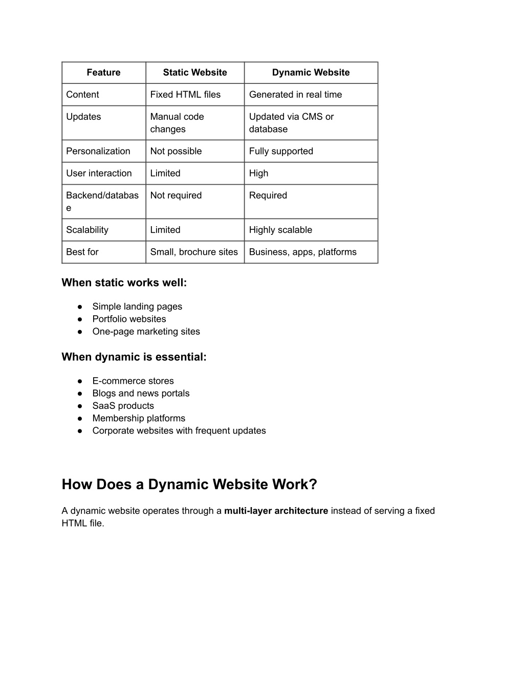 Feature Static Website Dynamic Website Content Fixed HTML files Generated in real time Updates Manual code changes Updated via CMS or database Personalization Not possible Fully supported User interaction Limited High Backend/databas e Not required Required Scalability Limited Highly scalable Best for Small, brochure sites Business, apps, platforms When static works well: ● Simple landing pages ● Portfolio websites ● One-page marketing sites When dynamic is essential: ● E-commerce stores ● Blogs and news portals ● SaaS products ● Membership platforms ● Corporate websites with frequent updates How Does a Dynamic Website Work? A dynamic website operates through a multi-layer architecture instead of serving a fixed HTML file.