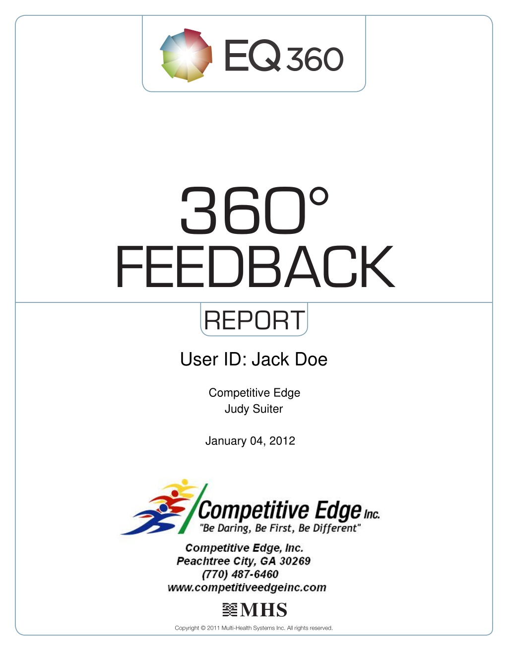 360° FEEDBACK REPORT User ID: Jack Doe Competitive Edge Judy Suiter January 04, 2012 Copyright © 2011 Multi-Health Systems Inc. All rights reserved.