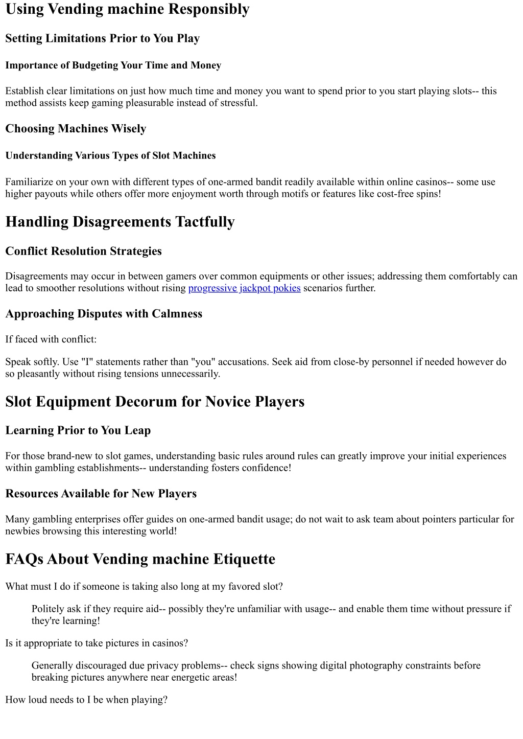 Using Vending machine Responsibly Setting Limitations Prior to You Play Importance of Budgeting Your Time and Money Establish clear limitations on just how much time and money you want to spend prior to you start playing slots-- this method assists keep gaming pleasurable instead of stressful. Choosing Machines Wisely Understanding Various Types of Slot Machines Familiarize on your own with different types of one-armed bandit readily available within online casinos-- some use higher payouts while others offer more enjoyment worth through motifs or features like cost-free spins! Handling Disagreements Tactfully Conflict Resolution Strategies Disagreements may occur in between gamers over common equipments or other issues; addressing them comfortably can lead to smoother resolutions without rising progressive jackpot pokies scenarios further. Approaching Disputes with Calmness If faced with conflict: Speak softly. Use "I" statements rather than "you" accusations. Seek aid from close-by personnel if needed however do so pleasantly without rising tensions unnecessarily. Slot Equipment Decorum for Novice Players Learning Prior to You Leap For those brand-new to slot games, understanding basic rules around rules can greatly improve your initial experiences within gambling establishments-- understanding fosters confidence! Resources Available for New Players Many gambling enterprises offer guides on one-armed bandit usage; do not wait to ask team about pointers particular for newbies browsing this interesting world! FAQs About Vending machine Etiquette What must I do if someone is taking also long at my favored slot? Politely ask if they require aid-- possibly they're unfamiliar with usage-- and enable them time without pressure if they're learning! Is it appropriate to take pictures in casinos? Generally discouraged due privacy problems-- check signs showing digital photography constraints before breaking pictures anywhere near energetic areas! How loud needs to I be when playing?