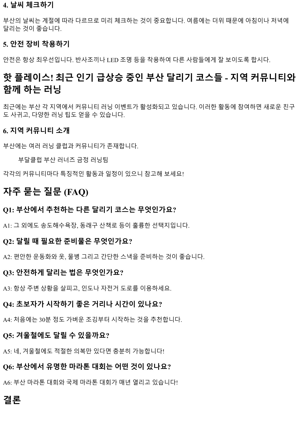 4. 날씨체크하기 부산의날씨는계절에따라다르므로미리체크하는것이중요합니다. 여름에는더위때문에아침이나저녁에 달리는것이좋습니다. 5. 안전장비착용하기 안전은항상최우선입니다. 반사조끼나 LED 조명등을착용하여다른사람들에게잘보이도록합시다. 핫플레이스! 최근인기급상승중인부산달리기코스들 - 지역커뮤니티와 함께하는러닝 최근에는부산각지역에서커뮤니티러닝이벤트가활성화되고있습니다. 이러한활동에참여하면새로운친구 도사귀고, 다양한러닝팁도얻을수있습니다. 6. 지역커뮤니티소개 부산에는여러러닝클럽과커뮤니티가존재합니다. 부달클럽부산러너즈금정러닝팀 각각의커뮤니티마다특징적인활동과일정이있으니참고해보세요! 자주묻는질문 (FAQ) Q1: 부산에서추천하는다른달리기코스는무엇인가요? A1: 그외에도송도해수욕장, 동래구산책로등이훌륭한선택지입니다. Q2: 달릴때필요한준비물은무엇인가요? A2: 편안한운동화와옷, 물병그리고간단한스낵을준비하는것이좋습니다. Q3: 안전하게달리는법은무엇인가요? A3: 항상주변상황을살피고, 인도나자전거도로를이용하세요. Q4: 초보자가시작하기좋은거리나시간이있나요? A4: 처음에는 30분정도가벼운조깅부터시작하는것을추천합니다. Q5: 겨울철에도달릴수있을까요? A5: 네, 겨울철에도적절한의복만있다면충분히가능합니다! Q6: 부산에서유명한마라톤대회는어떤것이있나요? A6: 부산마라톤대회와국제마라톤대회가매년열리고있습니다! 결론