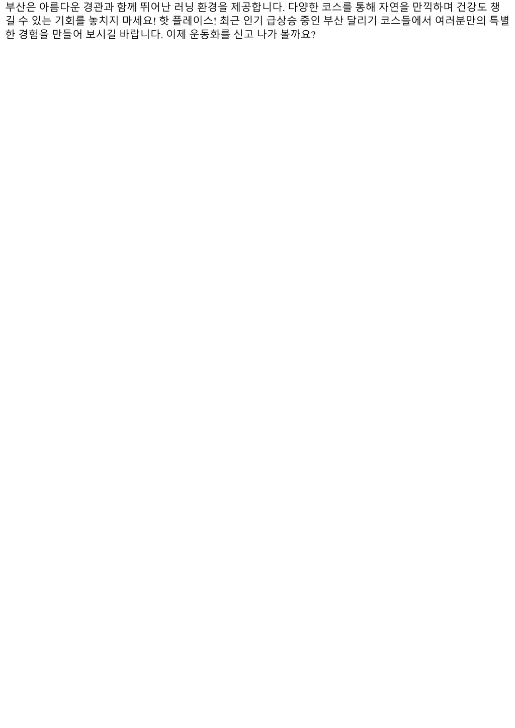 부산은아름다운경관과함께뛰어난러닝환경을제공합니다. 다양한코스를통해자연을만끽하며건강도챙 길수있는기회를놓치지마세요! 핫플레이스! 최근인기급상승중인부산달리기코스들에서여러분만의특별 한경험을만들어보시길바랍니다. 이제운동화를신고나가볼까요?