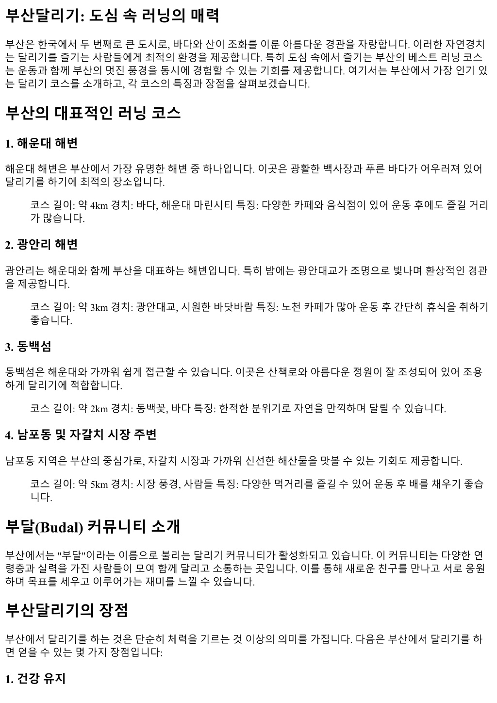 부산달리기: 도심속러닝의매력 부산은한국에서두번째로큰도시로, 바다와산이조화를이룬아름다운경관을자랑합니다. 이러한자연경치 는달리기를즐기는사람들에게최적의환경을제공합니다. 특히도심속에서즐기는부산의베스트러닝코스 는운동과함께부산의멋진풍경을동시에경험할수있는기회를제공합니다. 여기서는부산에서가장인기있 는달리기코스를소개하고, 각코스의특징과장점을살펴보겠습니다. 부산의대표적인러닝코스 1. 해운대해변 해운대해변은부산에서가장유명한해변중하나입니다. 이곳은광활한백사장과푸른바다가어우러져있어 달리기를하기에최적의장소입니다. 코스길이: 약 4km 경치: 바다, 해운대마린시티특징: 다양한카페와음식점이있어운동후에도즐길거리 가많습니다. 2. 광안리해변 광안리는해운대와함께부산을대표하는해변입니다. 특히밤에는광안대교가조명으로빛나며환상적인경관 을제공합니다. 코스길이: 약 3km 경치: 광안대교, 시원한바닷바람특징: 노천카페가많아운동후간단히휴식을취하기 좋습니다. 3. 동백섬 동백섬은해운대와가까워쉽게접근할수있습니다. 이곳은산책로와아름다운정원이잘조성되어있어조용 하게달리기에적합합니다. 코스길이: 약 2km 경치: 동백꽃, 바다특징: 한적한분위기로자연을만끽하며달릴수있습니다. 4. 남포동및자갈치시장주변 남포동지역은부산의중심가로, 자갈치시장과가까워신선한해산물을맛볼수있는기회도제공합니다. 코스길이: 약 5km 경치: 시장풍경, 사람들특징: 다양한먹거리를즐길수있어운동후배를채우기좋습 니다. 부달(Budal) 커뮤니티소개 부산에서는 "부달"이라는이름으로불리는달리기커뮤니티가활성화되고있습니다. 이커뮤니티는다양한연 령층과실력을가진사람들이모여함께달리고소통하는곳입니다. 이를통해새로운친구를만나고서로응원 하며목표를세우고이루어가는재미를느낄수있습니다. 부산달리기의장점 부산에서달리기를하는것은단순히체력을기르는것이상의의미를가집니다. 다음은부산에서달리기를하 면얻을수있는몇가지장점입니다: 1. 건강유지