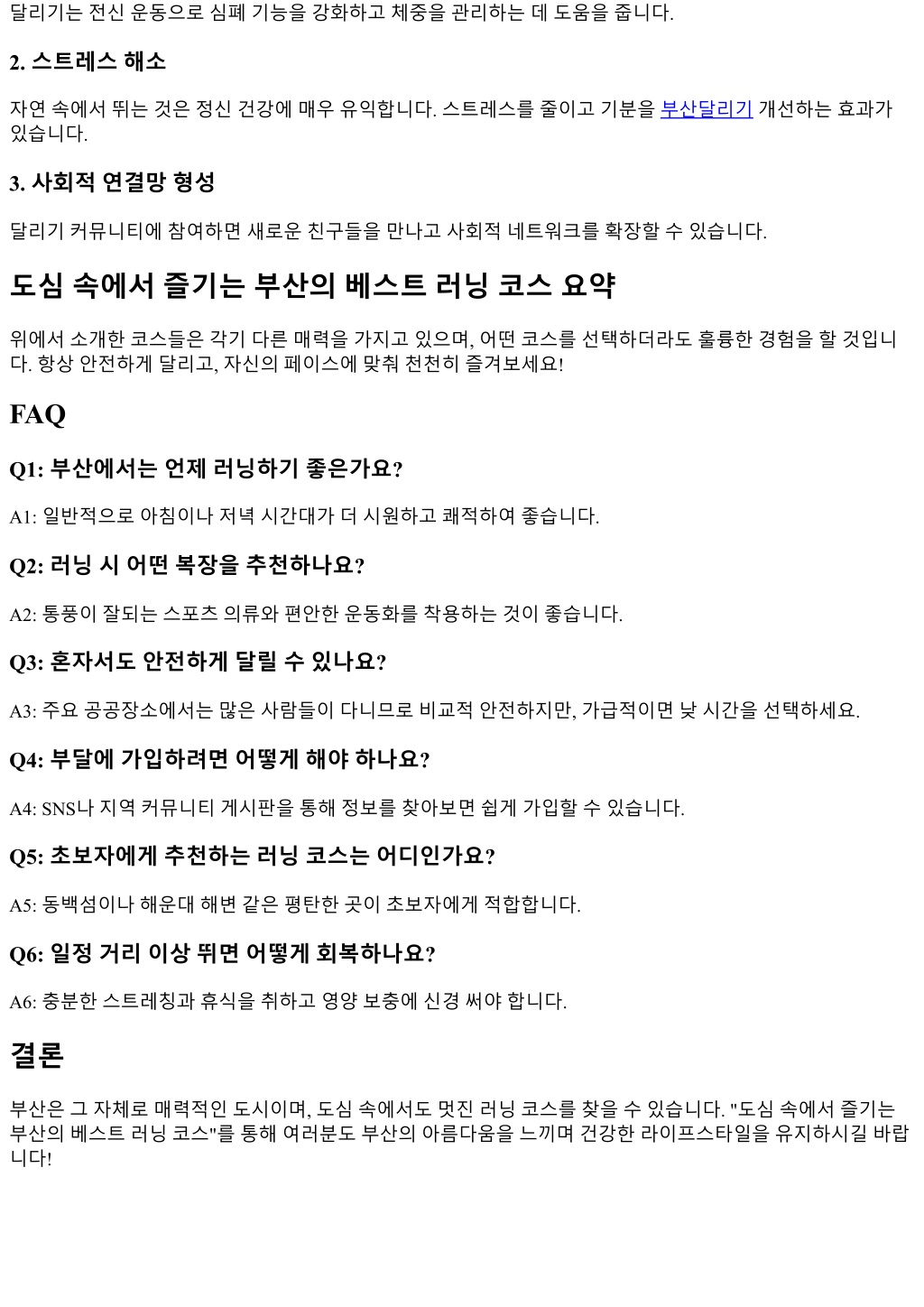 달리기는전신운동으로심폐기능을강화하고체중을관리하는데도움을줍니다.달리기는전신운동으로심폐기능을강화하고체중을관리하는데도움을줍니다. 2. 스트레스해소 자연속에서뛰는것은정신건강에매우유익합니다. 스트레스를줄이고기분을부산달리기개선하는효과가 있습니다. 3. 사회적연결망형성 달리기커뮤니티에참여하면새로운친구들을만나고사회적네트워크를확장할수있습니다. 도심속에서즐기는부산의베스트러닝코스요약 위에서소개한코스들은각기다른매력을가지고있으며, 어떤코스를선택하더라도훌륭한경험을할것입니 다. 항상안전하게달리고, 자신의페이스에맞춰천천히즐겨보세요! FAQ Q1: 부산에서는언제러닝하기좋은가요? A1: 일반적으로아침이나저녁시간대가더시원하고쾌적하여좋습니다. Q2: 러닝시어떤복장을추천하나요? A2: 통풍이잘되는스포츠의류와편안한운동화를착용하는것이좋습니다. Q3: 혼자서도안전하게달릴수있나요? A3: 주요공공장소에서는많은사람들이다니므로비교적안전하지만, 가급적이면낮시간을선택하세요. Q4: 부달에가입하려면어떻게해야하나요? A4: SNS나지역커뮤니티게시판을통해정보를찾아보면쉽게가입할수있습니다. Q5: 초보자에게추천하는러닝코스는어디인가요? A5: 동백섬이나해운대해변같은평탄한곳이초보자에게적합합니다. Q6: 일정거리이상뛰면어떻게회복하나요? A6: 충분한스트레칭과휴식을취하고영양보충에신경써야합니다. 결론 부산은그자체로매력적인도시이며, 도심속에서도멋진러닝코스를찾을수있습니다. "도심속에서즐기는 부산의베스트러닝코스"를통해여러분도부산의아름다움을느끼며건강한라이프스타일을유지하시길바랍 니다!