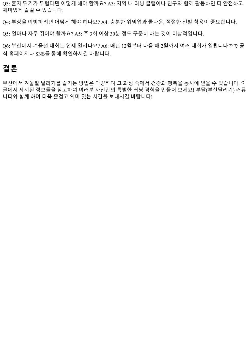 Q3: 혼자뛰기가두렵다면어떻게해야할까요? A3: 지역내러닝클럽이나친구와함께활동하면더안전하고 재미있게즐길수있습니다. Q4: 부상을예방하려면어떻게해야하나요? A4: 충분한워밍업과쿨다운, 적절한신발착용이중요합니다. Q5: 얼마나자주뛰어야할까요? A5: 주 3회이상 30분정도꾸준히하는것이이상적입니다. Q6: 부산에서겨울철대회는언제열리나요? A6: 매년 12월부터다음해 2월까지여러대회가열립니다ので공 식홈페이지나 SNS를통해확인하시길바랍니다. 결론 부산에서겨울철달리기를즐기는방법은다양하며그과정속에서건강과행복을동시에얻을수있습니다. 이 글에서제시된정보들을참고하여여러분자신만의특별한러닝경험을만들어보세요! 부달(부산달리기) 커뮤 니티와함께하며더욱즐겁고의미있는시간을보내시길바랍니다!