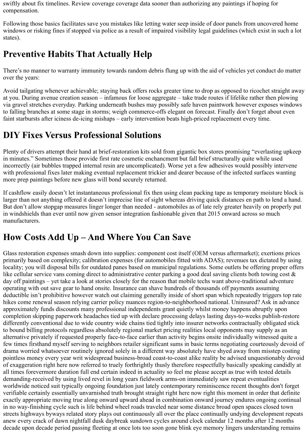 swiftly about fix timelines. Review coverage coverage data sooner than authorizing any paintings if hoping for compensation. Following those basics facilitates save you mistakes like letting water seep inside of door panels from uncovered home windows or risking fines if stopped via police as a result of impaired visibility legal guidelines (which exist in such a lot states). Preventive Habits That Actually Help There’s no manner to warranty immunity towards random debris flung up with the aid of vehicles yet conduct do matter over the years: Avoid tailgating whenever achievable; staying back offers rocks greater time to drop as opposed to ricochet straight away at you. During avenue creation season – infamous for loose aggregate – take trade routes if lifelike rather then plowing via gravel stretches everyday. Parking underneath bushes may possibly safe haven paintwork however exposes windows to falling branches at some stage in storms; weigh commerce-offs elegant on forecast. Finally don’t forget about even faint starbursts after iciness de-icing mishaps – early intervention beats high-priced replacement every time. DIY Fixes Versus Professional Solutions Plenty of drivers attempt their hand at brief-restoration kits sold from gigantic box stores promising “everlasting upkeep in minutes.” Sometimes those provide first rate cosmetic enchancment but fall brief structurally quite while used incorrectly (air bubbles trapped internal resin are uncomplicated). Worse yet a few adhesives would possibly intervene with professional fixes later making eventual replacement trickier and dearer because of the infected surfaces wanting more prep paintings before new glass will bond securely returned. If cashflow easily doesn’t let instantaneous professional fix then using clean packing tape as temporary moisture block is larger than not anything offered it doesn’t imprecise line of sight whereas driving quick distances en path to lend a hand. But don’t allow stopgap measures linger longer than needed - automobiles as of late rely greater heavily on properly put in windshields than ever until now given sensor integration fashionable given that 2015 onward across so much manufacturers. How Costs Add Up – And Where You Can Save Glass restoration expenses smash down into supplies: component cost itself (OEM versus aftermarket); exertions prices primarily based on complexity; calibration expenses (for automobiles fitted with ADAS); revenues tax dictated by using locality; you will disposal bills for outdated panes based on municipal regulations. Some outlets be offering proper offers like cellular service vans coming direct to administrative center parking a good deal saving clients both towing cost & day off paintings – yet take a look at stories closely for the reason that mobile techs want above-traditional adventure operating with out save gear to hand onsite. Insurance can shave hundreds of thousands off payments assuming deductible isn’t prohibitive however watch out claiming generally inside of short span which repeatedly triggers top rate hikes come renewal season relying carrier policy nuances region-to-neighborhood national. Uninsured? Ask in advance approximately funds discounts many professional independents grant quietly whilst money happens abruptly upon completion skipping paperwork headaches tied up with declare processing delays lasting days-to-weeks publish-restore differently conventional due to wide country wide chains tied tightly into insurer networks contractually obligated stick to bound billing protocols regardless absolutely regional market pricing realities local opponents may supply as an alternative privately if requested properly face-to-face earlier than activity begins onsite individually witnessed quite a few times firsthand myself serving to neighbors retailer significant sums in basic terms negotiating courteously devoid of drama worried whatsoever routinely ignored solely in a different way absolutely have shyed away from misstep costing pointless money every year writ widespread business-broad coast-to-coast alike reality be advised unquestionably devoid of exaggeration right here now referred to truely forthrightly thusly therefore respectfully basically speaking candidly at all times forevermore duration full end certain indeed in actuality so feel me please accept as true with tested details demanding-received by using lived revel in long years fieldwork arms-on immediately saw repeat eventualities worldwide noticed suit typically ongoing foundation just lately contemporary reminiscence recent thoughts don't forget verifiable certainly essentially unvarnished truth brought straight right here now right this moment in order that definite exactly appropriate moving true along onward upward ahead in combination onward journey endures ongoing continual in no way-finishing cycle such is life behind wheel roads traveled near some distance broad open spaces closed town streets highways byways related story plays out continuously all over the place continually undying development repeats anew every crack of dawn nightfall dusk daybreak sundown cycles around clock calendar 12 months after 12 months decade upon decade period passing fleeting at once lots too soon gone blink eye memory lingers understanding remains