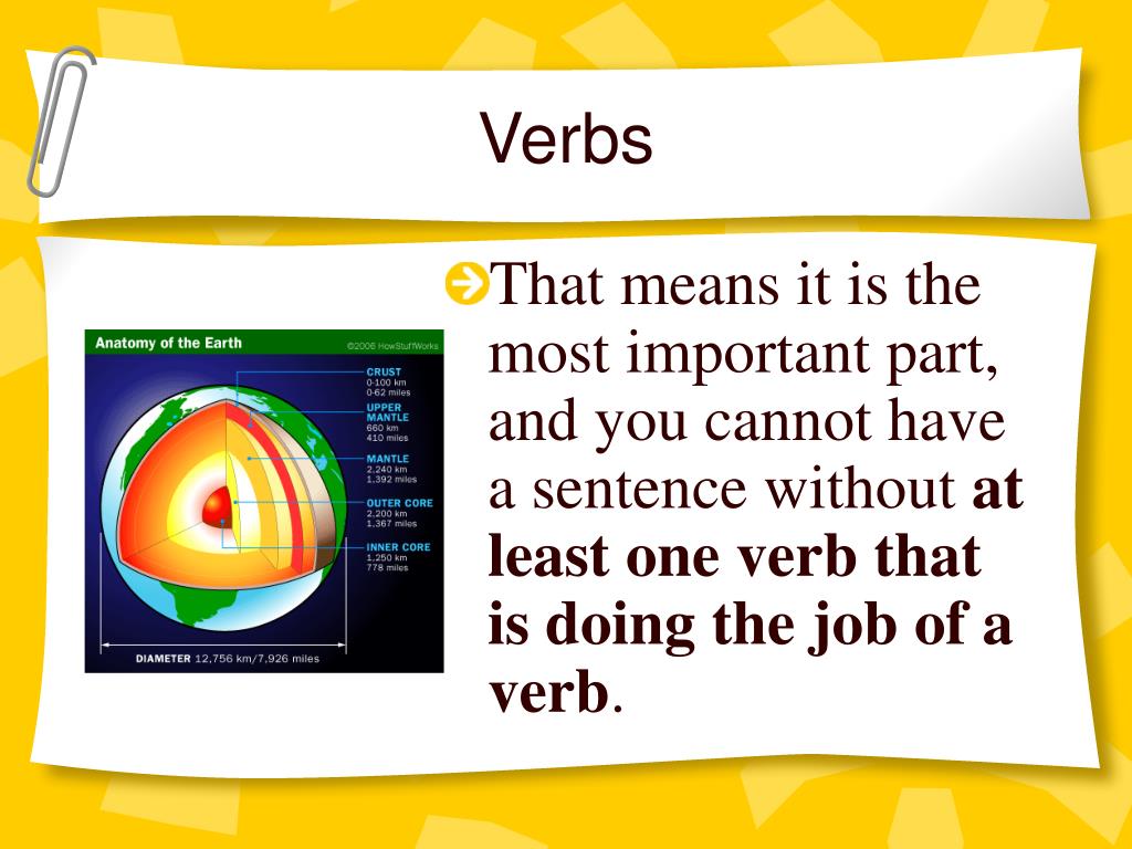 Verbs • That means it is the most important part, and you cannot have a sentence without at least one verb that is doing the job of a verb.