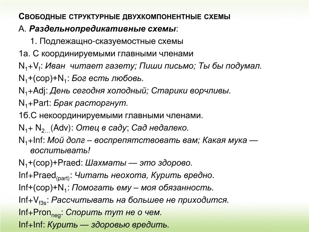 Свободные структурные двухкомпонентные схемы А. Раздельнопредикативные схемы: 1. Подлежащно-сказуемостные схемы 1а. С координируемыми главными членами N1+Vf: Иван читает газету; Пиши письмо; Ты бы подумал. N1+(сор)+N1: Бог есть любовь. N1+Adj: День сегодня холодный;Старики ворчливы. N1+Part: Брак расторгнут. 1б.С некоординируемыми главными членами. N1+ N2…(Adv): Отец в саду; Сад недалеко. N1+Inf: Мой долг – воспрепятствовать вам; Какая мука — воспитывать! N1+(сор)+Praed: Шахматы — это здорово. Inf+Praed(part): Читать неохота, Курить вредно. Inf+(сор)+N1: Помогать ему – моя обязанность. Inf+Vf3s: Рассчитывать на большее не приходится. Inf+Pronneg: Спорить тут не о чем. Inf+Inf: Курить — здоровью вредить.