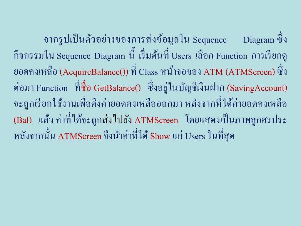 จากรูปเป็นภาพของ Sequence Diagram ที่แสดงกิจกรรมใน Use Case การขอดูยอดเงินคงเหลือจากเครื่อง ATM โดยจะให้ผู้ใช้เครื่อง ซึ่งถือเป็น Actor เป็น Class ที่อยู่ทางซ้ายสุดของ Sequence Diagram ถัดมาคือเครื่อง ATM ซึ่งเครื่อง ATM นั้นประกอบด้วย (Aggregation) ปุ่มหมายเลข และหน้าจอ ซึ่งเป็น Class ที่แสดงไว้ในอันดับถัดมา และบัญชีเงินฝาก เป็น Class ที่อยู่ทางขวาสุดของ Sequence Diagram