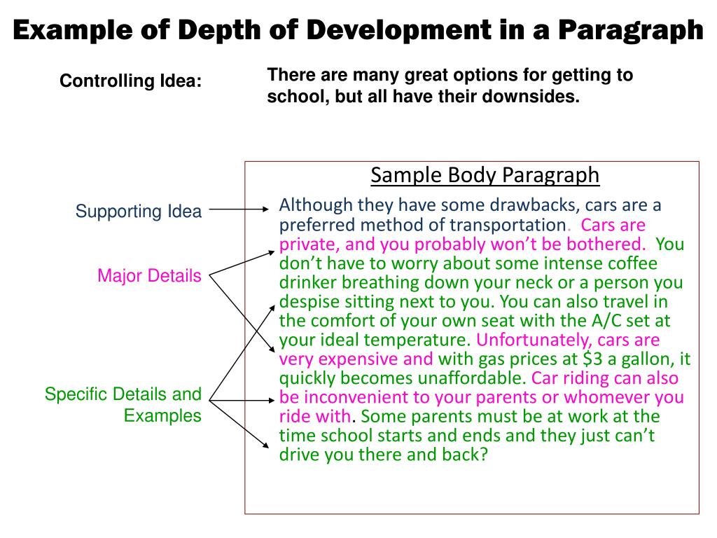 Example of Depth of Development in a Paragraph There are many great options for getting to school, but all have their downsides. Controlling Idea: Sample Body Paragraph Although they have some drawbacks, cars are a preferred method of transportation. Cars are private, and you probably won’t be bothered. You don’t have to worry about some intense coffee drinker breathing down your neck or a person you despise sitting next to you. You can also travel in the comfort of your own seat with the A/C set at your ideal temperature.Unfortunately, cars are very expensive and with gas prices at $3 a gallon, it quickly becomes unaffordable.Car riding can also be inconvenient to your parents or whomever you ride with. Some parents must be at work at the time school starts and ends and they just can’t drive you there and back? Supporting Idea Major Details Specific Details and Examples