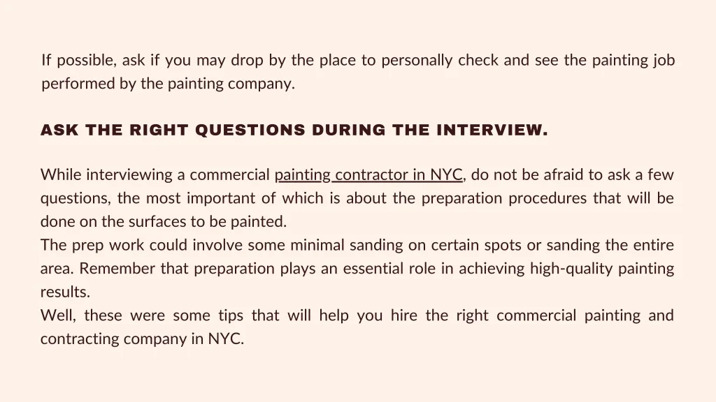 If possible, ask if you may drop by the place to personally check and see the painting job performed by the painting company. ASK THE RIGHT QUESTIONS DURING THE INTERVIEW. While interviewing a commercial painting contractor in NYC, do not be afraid to ask a few questions, the most important of which is about the preparation procedures that will be done on the surfaces to be painted. The prep work could involve some minimal sanding on certain spots or sanding the entire area. Remember that preparation plays an essential role in achieving high-quality painting results. Well, these were some tips that will help you hire the right commercial painting and contracting company in NYC.