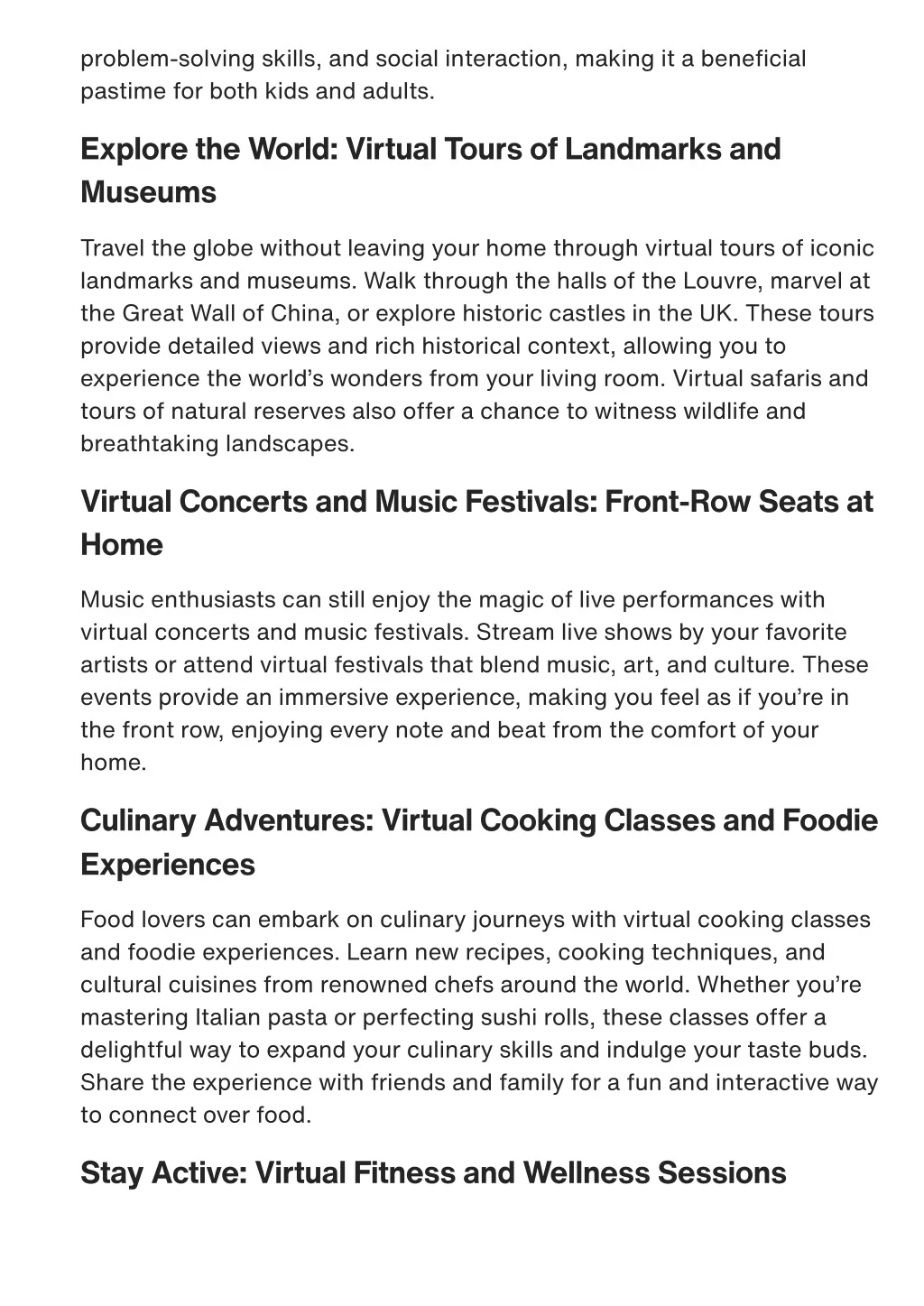 problem-solving skills, and social interaction, making it a beneficial pastime for both kids and adults. Explore the World: Virtual Tours of Landmarks and Museums Travel the globe without leaving your home through virtual tours of iconic landmarks and museums. Walk through the halls of the Louvre, marvel at the Great Wall of China, or explore historic castles in the UK. These tours provide detailed views and rich historical context, allowing you to experience the world’s wonders from your living room. Virtual safaris and tours of natural reserves also offer a chance to witness wildlife and breathtaking landscapes. Virtual Concerts and Music Festivals: Front-Row Seats at Home Music enthusiasts can still enjoy the magic of live performances with virtual concerts and music festivals. Stream live shows by your favorite artists or attend virtual festivals that blend music, art, and culture. These events provide an immersive experience, making you feel as if you’re in the front row, enjoying every note and beat from the comfort of your home. Culinary Adventures: Virtual Cooking Classes and Foodie Experiences Food lovers can embark on culinary journeys with virtual cooking classes and foodie experiences. Learn new recipes, cooking techniques, and cultural cuisines from renowned chefs around the world. Whether you’re mastering Italian pasta or perfecting sushi rolls, these classes offer a delightful way to expand your culinary skills and indulge your taste buds. Share the experience with friends and family for a fun and interactive way to connect over food. Stay Active: Virtual Fitness and Wellness Sessions