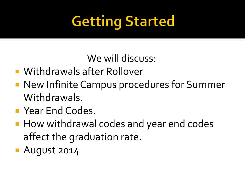 Getting Started We will discuss: • Withdrawals after Rollover • New Infinite Campus procedures for Summer Withdrawals. • Year End Codes. • How withdrawal codes and year end codes affect the graduation rate. • August 2014