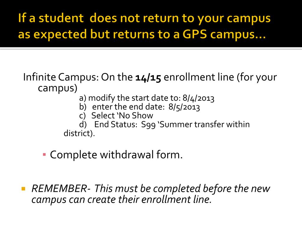 If a student does not return to your campus as expected but returns to a GPS campus… Infinite Campus: On the 14/15 enrollment line (for your campus) a) modify the start date to: 8/4/2013 b) enter the end date: 8/5/2013 c) Select ‘No Show d) End Status: S99 ‘Summer transfer within district). • Complete withdrawal form. • REMEMBER- This must be completed before the new campus can create their enrollment line.