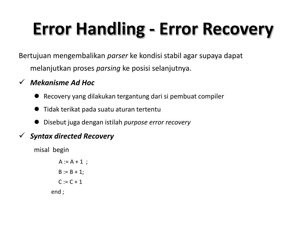 Error Handling - Error Recovery Bertujuan mengembalikan parser ke kondisi stabil agar supaya dapat melanjutkan proses parsing ke posisi selanjutnya. • Mekanisme Ad Hoc • Recovery yang dilakukan tergantung dari si pembuat compiler • Tidak terikat pada suatu aturan tertentu • Disebut juga dengan istilah purpose error recovery • Syntax directed Recovery misal begin A := A + 1 ; B := B + 1; C := C + 1 end ;