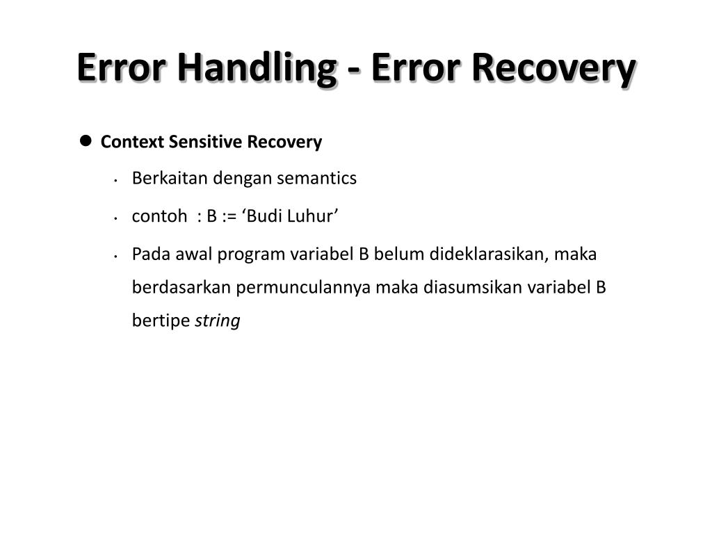 Error Handling - Error Recovery • Context Sensitive Recovery • Berkaitan dengan semantics • contoh : B := ‘Budi Luhur’ • Pada awal program variabel B belum dideklarasikan, maka berdasarkan permunculannya maka diasumsikan variabel B bertipe string