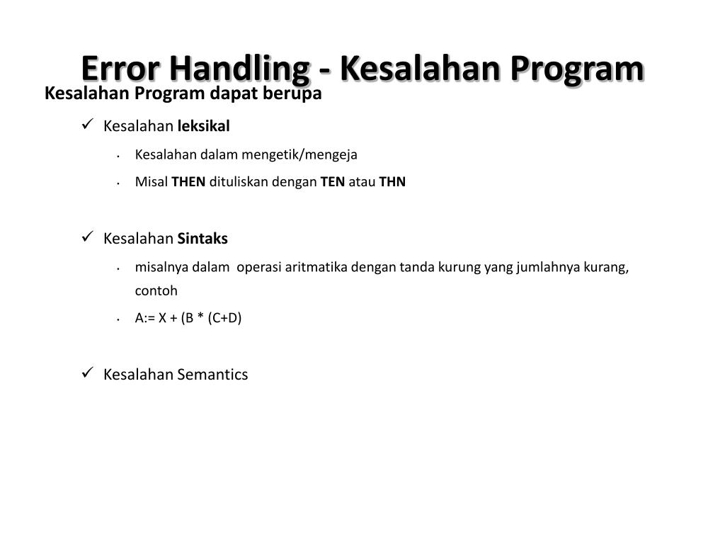 Error Handling - Kesalahan Program Kesalahan Program dapat berupa • Kesalahan leksikal • Kesalahan dalam mengetik/mengeja • Misal THEN dituliskan dengan TEN atau THN • Kesalahan Sintaks • misalnya dalam operasi aritmatika dengan tanda kurung yang jumlahnya kurang, contoh • A:= X + (B * (C+D) • Kesalahan Semantics