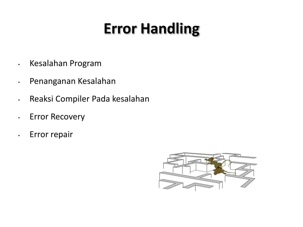 Error Handling • Kesalahan Program • Penanganan Kesalahan • Reaksi Compiler Pada kesalahan • Error Recovery • Error repair