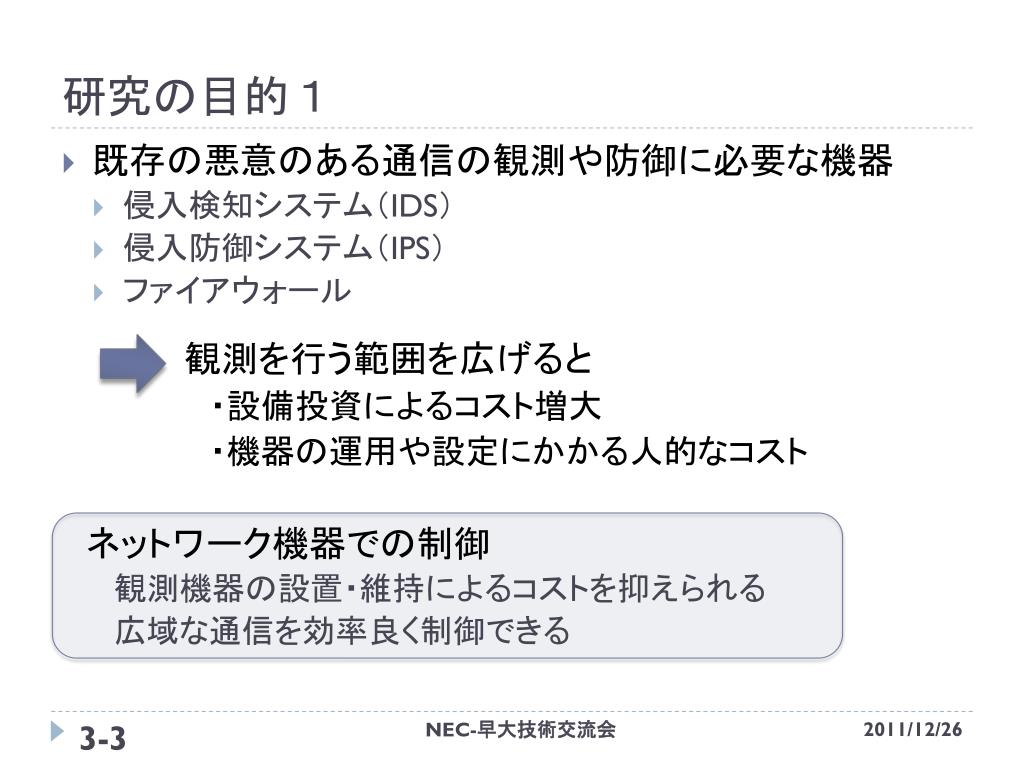研究の目的1 • 既存の悪意のある通信の観測や防御に必要な機器 • 侵入検知システム(IDS) • 侵入防御システム(IPS) • ファイアウォール 観測を行う範囲を広げると ・設備投資によるコスト増大 ・機器の運用や設定にかかる人的なコスト ネットワーク機器での制御 観測機器の設置・維持によるコストを抑えられる 広域な通信を効率良く制御できる NEC-早大技術交流会