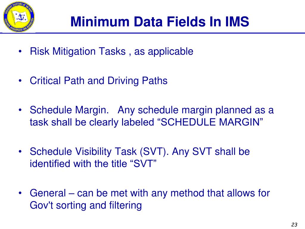 Minimum Data Fields In IMS • Risk Mitigation Tasks , as applicable • Critical Path and Driving Paths • Schedule Margin. Any schedule margin planned as a task shall be clearly labeled “SCHEDULE MARGIN” • Schedule Visibility Task (SVT). Any SVT shall be identified with the title “SVT” • General – can be met with any method that allows for Gov't sorting and filtering