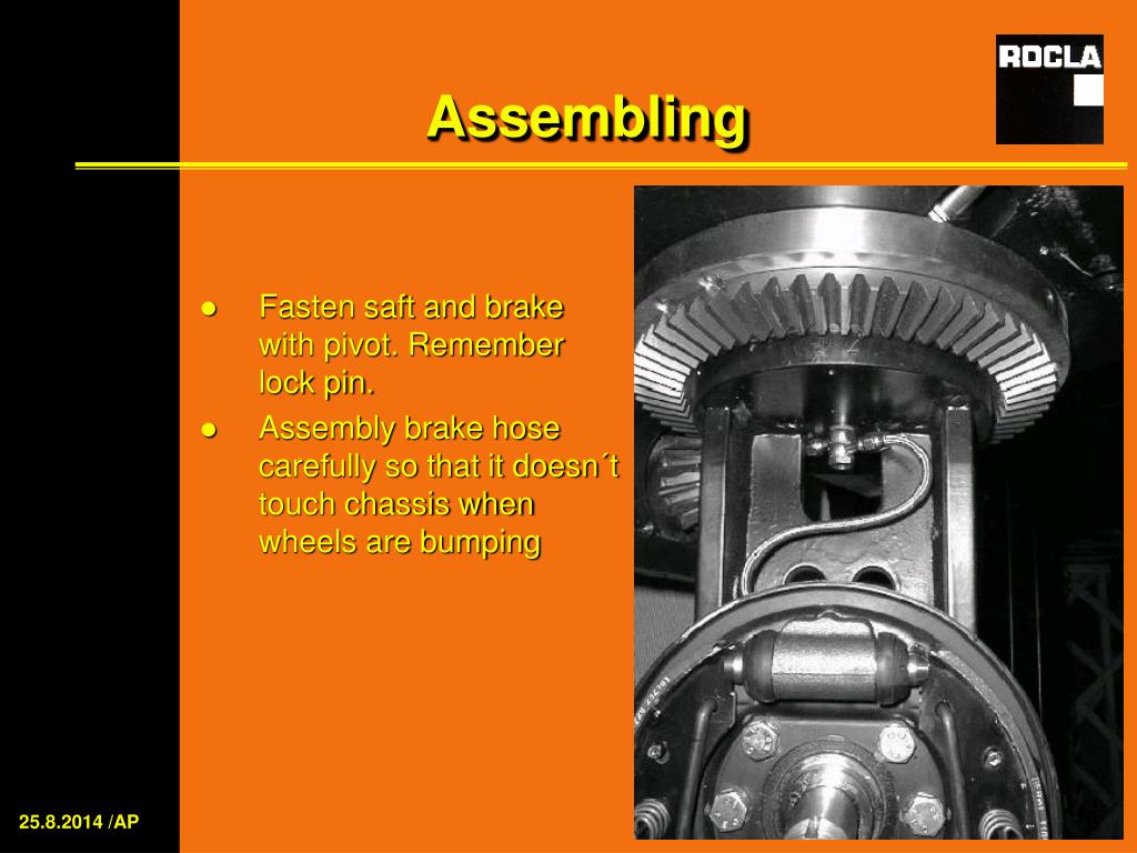 Assembling • Fasten saft and brake with pivot. Remember lock pin. • Assembly brake hose carefully so that it doesn´t touch chassis when wheels are bumping