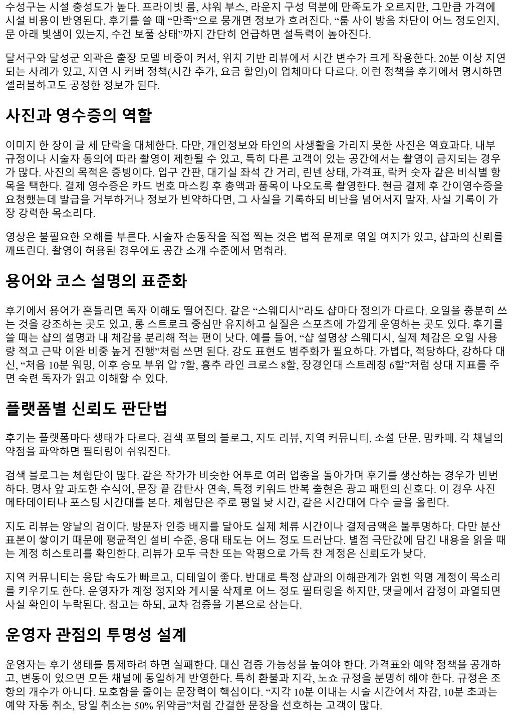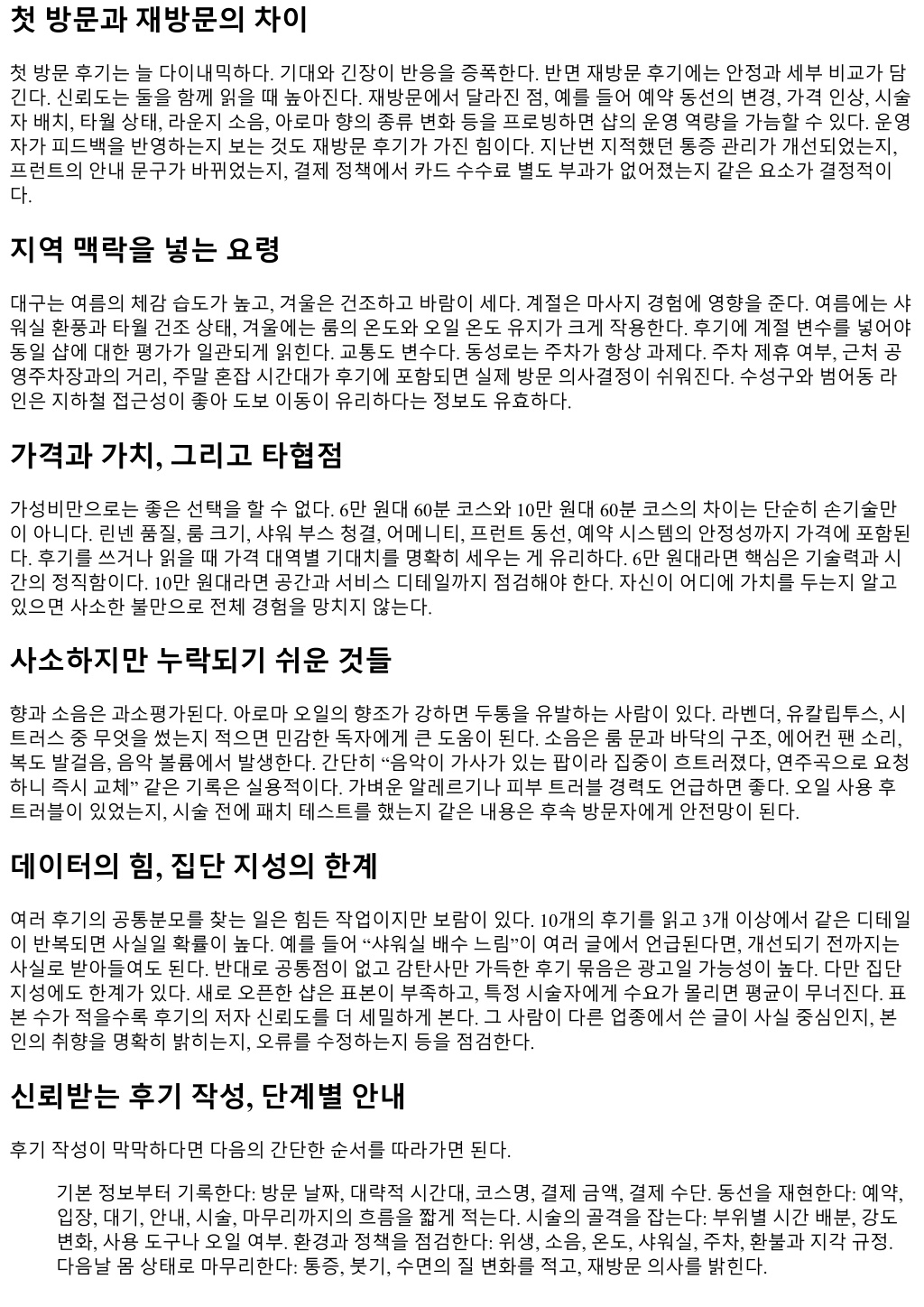 수성구는시설충성도가높다. 프라이빗룸, 샤워부스, 라운지구성덕분에만족도가오르지만, 그만큼가격에 시설비용이반영된다. 후기를쓸때 “만족”으로뭉개면정보가흐려진다. “룸사이방음차단이어느정도인지, 문아래빛샘이있는지, 수건보풀상태”까지간단히언급하면설득력이높아진다. 달서구와달성군외곽은출장모델비중이커서, 위치기반리뷰에서시간변수가크게작용한다. 20분이상지연 되는사례가있고, 지연시커버정책(시간추가, 요금할인)이업체마다다르다. 이런정책을후기에서명시하면 셀러블하고도공정한정보가된다. 사진과영수증의역할 이미지한장이글세단락을대체한다. 다만, 개인정보와타인의사생활을가리지못한사진은역효과다. 내부 규정이나시술자동의에따라촬영이제한될수있고, 특히다른고객이있는공간에서는촬영이금지되는경우 가많다. 사진의목적은증빙이다. 입구간판, 대기실좌석간거리, 린넨상태, 가격표, 락커숫자같은비식별항 목을택한다. 결제영수증은카드번호마스킹후총액과품목이나오도록촬영한다. 현금결제후간이영수증을 요청했는데발급을거부하거나정보가빈약하다면, 그사실을기록하되비난을넘어서지말자. 사실기록이가 장강력한목소리다. 영상은불필요한오해를부른다. 시술자손동작을직접찍는것은법적문제로엮일여지가있고, 샵과의신뢰를 깨뜨린다. 촬영이허용된경우에도공간소개수준에서멈춰라. 용어와코스설명의표준화 후기에서용어가흔들리면독자이해도떨어진다. 같은 “스웨디시”라도샵마다정의가다르다. 오일을충분히쓰 는것을강조하는곳도있고, 롱스트로크중심만유지하고실질은스포츠에가깝게운영하는곳도있다. 후기를 쓸때는샵의설명과내체감을분리해적는편이낫다. 예를들어, “샵설명상스웨디시, 실제체감은오일사용 량적고근막이완비중높게진행”처럼쓰면된다. 강도표현도범주화가필요하다. 가볍다, 적당하다, 강하다대 신, “처음 10분워밍, 이후승모부위압 7할, 흉추라인크로스 8할, 장경인대스트레칭 6할”처럼상대지표를주 면숙련독자가읽고이해할수있다. 플랫폼별신뢰도판단법 후기는플랫폼마다생태가다르다. 검색포털의블로그, 지도리뷰, 지역커뮤니티, 소셜단문, 맘카페. 각채널의 약점을파악하면필터링이쉬워진다. 검색블로그는체험단이많다. 같은작가가비슷한어투로여러업종을돌아가며후기를생산하는경우가빈번 하다. 명사앞과도한수식어, 문장끝감탄사연속, 특정키워드반복출현은광고패턴의신호다. 이경우사진 메타데이터나포스팅시간대를본다. 체험단은주로평일낮시간, 같은시간대에다수글을올린다. 지도리뷰는양날의검이다. 방문자인증배지를달아도실제체류시간이나결제금액은불투명하다. 다만분산 표본이쌓이기때문에평균적인설비수준, 응대태도는어느정도드러난다. 별점극단값에담긴내용을읽을때 는계정히스토리를확인한다. 리뷰가모두극찬또는악평으로가득찬계정은신뢰도가낮다. 지역커뮤니티는응답속도가빠르고, 디테일이좋다. 반대로특정샵과의이해관계가얽힌익명계정이목소리 를키우기도한다. 운영자가계정정지와게시물삭제로어느정도필터링을하지만, 댓글에서감정이과열되면 사실확인이누락된다. 참고는하되, 교차검증을기본으로삼는다. 운영자관점의투명성설계 운영자는후기생태를통제하려하면실패한다. 대신검증가능성을높여야한다. 가격표와예약정책을공개하 고, 변동이있으면모든채널에동일하게반영한다. 특히환불과지각, 노쇼규정을분명히해야한다. 규정은조 항의개수가아니다. 모호함을줄이는문장력이핵심이다. “지각 10분이내는시술시간에서차감, 10분초과는 예약자동취소, 당일취소는 50% 위약금”처럼간결한문장을선호하는고객이많다.