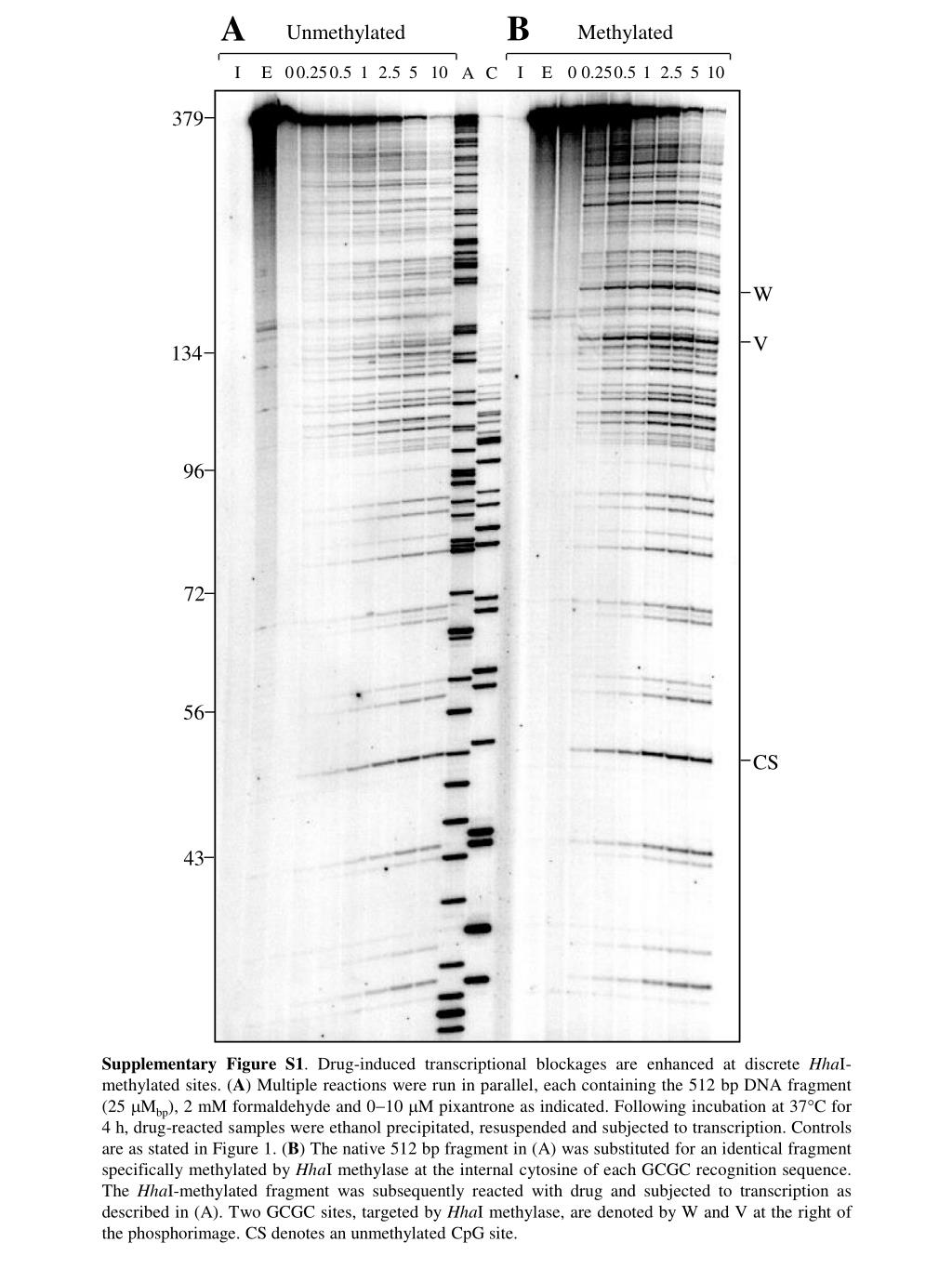 B A V W CS Unmethylated Methylated I E 0 0.25 0.5 1 2.5 5 10 I E 0 0.25 0.5 1 2.5 5 10 A C 379 134 96 72 56 43 Supplementary Figure S1. Drug-induced transcriptional blockages are enhanced at discrete HhaI-methylated sites. (A) Multiple reactions were run in parallel, each containing the 512 bp DNA fragment (25 Mbp), 2 mM formaldehyde and 010 M pixantrone as indicated. Following incubation at 37C for 4 h, drug-reacted samples were ethanol precipitated, resuspended and subjected to transcription. Controls are as stated in Figure 1. (B) The native 512 bp fragment in (A) was substituted for an identical fragment specifically methylated by HhaI methylase at the internal cytosine of each GCGC recognition sequence. The HhaI-methylated fragment was subsequently reacted with drug and subjected to transcription as described in (A). Two GCGC sites, targeted by HhaI methylase, are denoted by W and V at the right of the phosphorimage. CS denotes an unmethylated CpG site.
