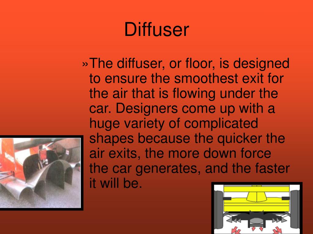 Diffuser • The diffuser, or floor, is designed to ensure the smoothest exit for the air that is flowing under the car. Designers come up with a huge variety of complicated shapes because the quicker the air exits, the more down force the car generates, and the faster it will be.