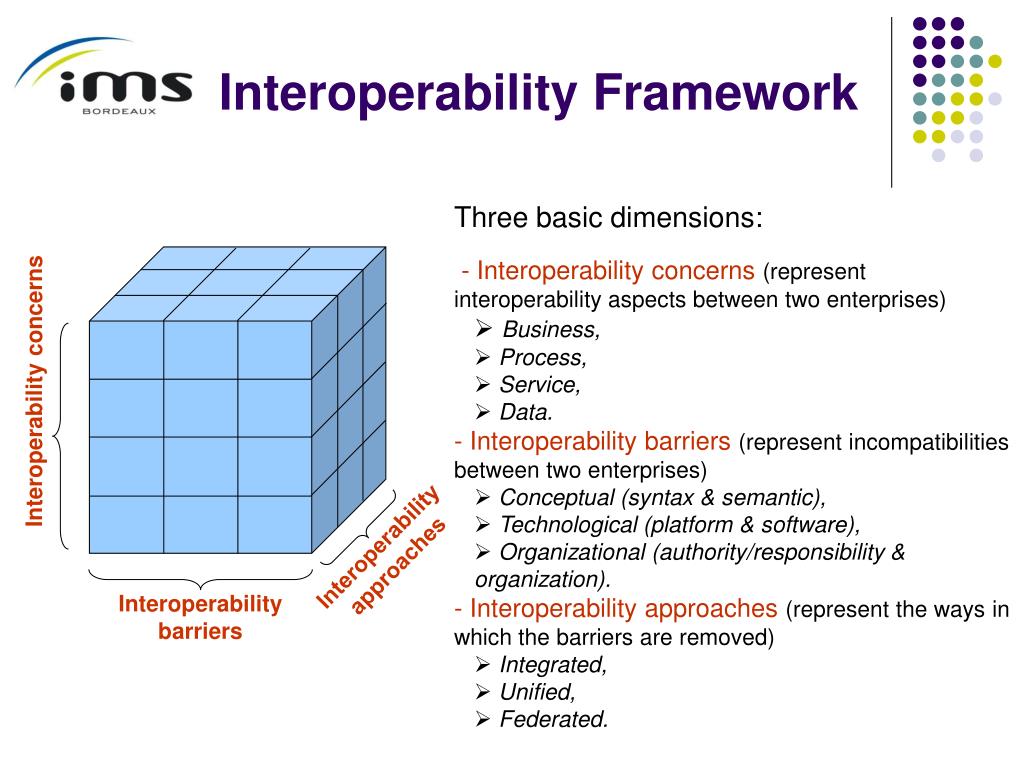 Interoperability concerns Interoperability approaches Interoperability barriers Interoperability Framework • Three basic dimensions: • - Interoperability concerns (represent interoperability aspects between two enterprises) • Business, • Process, • Service, • Data. • - Interoperability barriers (represent incompatibilities between two enterprises) • Conceptual (syntax & semantic), • Technological (platform & software), • Organizational (authority/responsibility & organization). • - Interoperability approaches (represent the ways in which the barriers are removed) • Integrated, • Unified, • Federated.