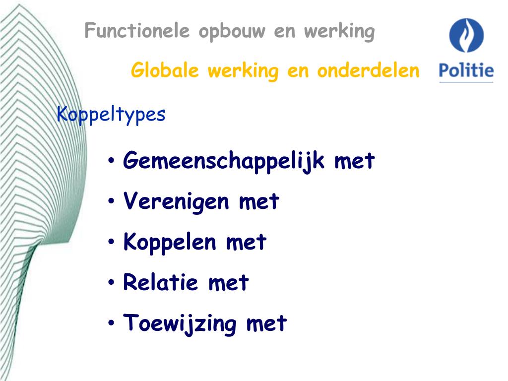 Functionele opbouw en werking Globale werking en onderdelen Koppeltypes • Gemeenschappelijk met • Verenigen met • Koppelen met • Relatie met • Toewijzing met