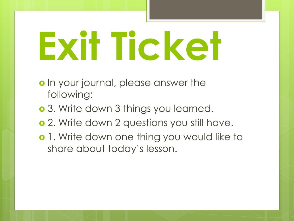 Exit Ticket • In your journal, please answer the following: • 3. Write down 3 things you learned. • 2. Write down 2 questions you still have. • 1. Write down one thing you would like to share about today’s lesson.