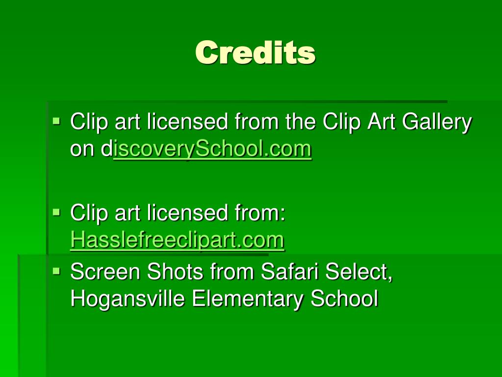 Credits Clip art licensed from the Clip Art Gallery on discoverySchool.com Clip art licensed from: Hasslefreeclipart.com Screen Shots from Safari Select, Hogansville Elementary School