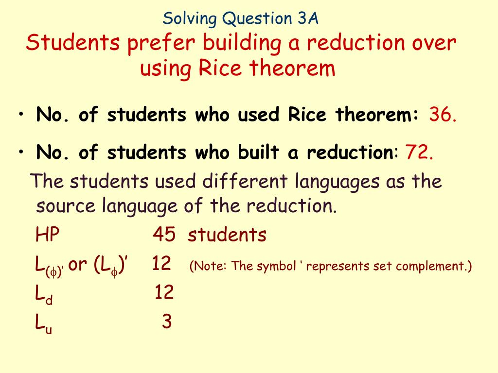 Solving Question 3AStudents prefer building a reduction over using Rice theorem • No. of students who used Rice theorem:36. • No. of students who built a reduction:72. The students used different languages as the source language of the reduction. HP 45 students L()’ or (L)’ 12 (Note: The symbol ‘ represents set complement.) Ld 12 Lu 3