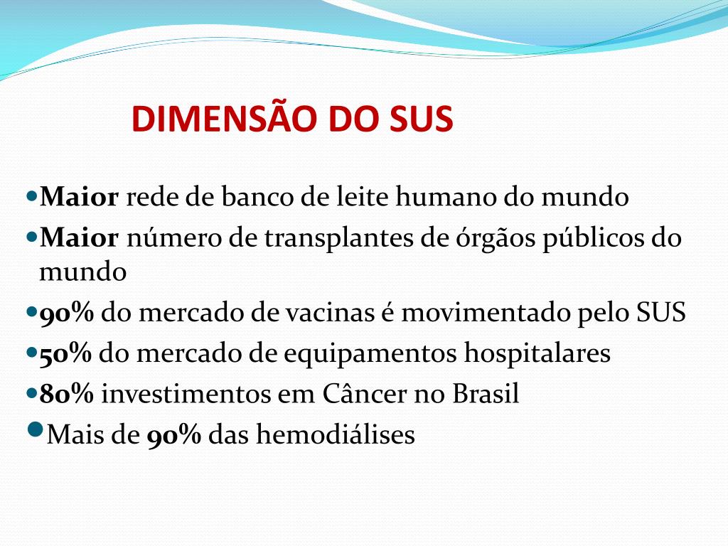 DIMENSÃO DO SUS • Maior rede de banco de leite humano do mundo • Maior número de transplantes de órgãos públicos do mundo • 90% do mercado de vacinas é movimentado pelo SUS • 50% do mercado de equipamentos hospitalares • 80% investimentos em Câncer no Brasil • Mais de 90% das hemodiálises