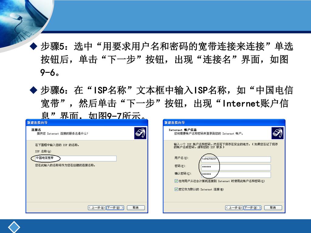 步骤5:选中“用要求用户名和密码的宽带连接来连接”单选按钮后,单击“下一步”按钮,出现“连接名”界面,如图9-6。步骤5:选中“用要求用户名和密码的宽带连接来连接”单选按钮后,单击“下一步”按钮,出现“连接名”界面,如图9-6。 • 步骤6:在“ISP名称”文本框中输入ISP名称,如“中国电信宽带”,然后单击“下一步”按钮,出现“Internet账户信息”界面,如图9-7所示。