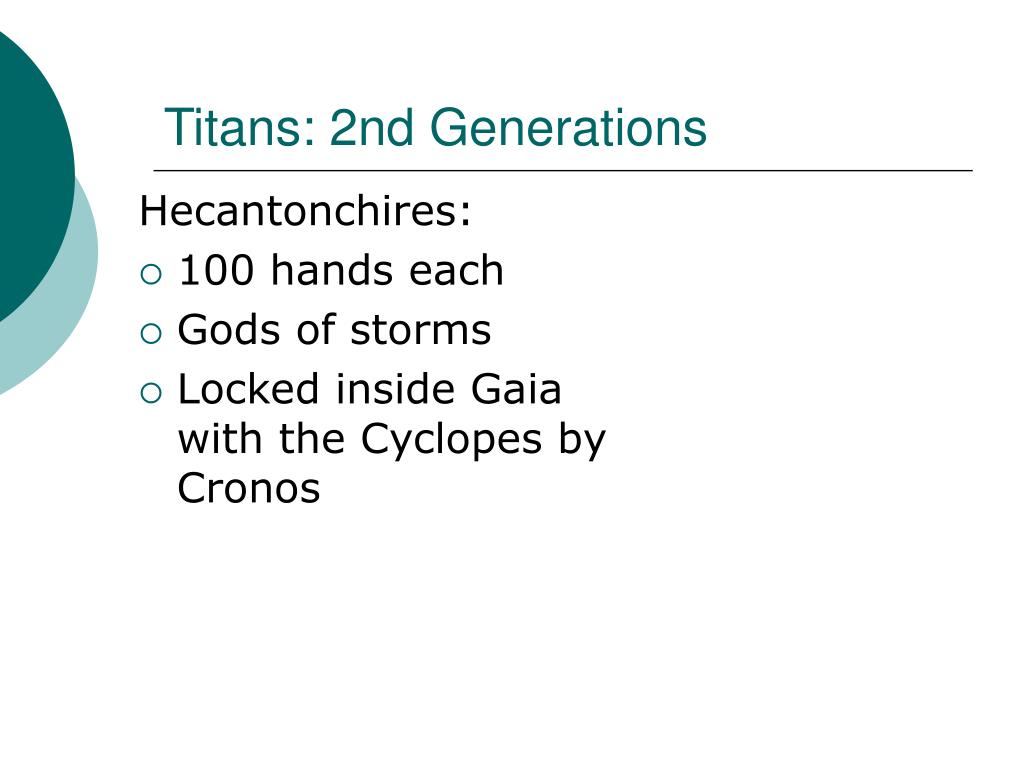 Titans: 2nd Generations Hecantonchires: • 100 hands each • Gods of storms • Locked inside Gaia with the Cyclopes by Cronos