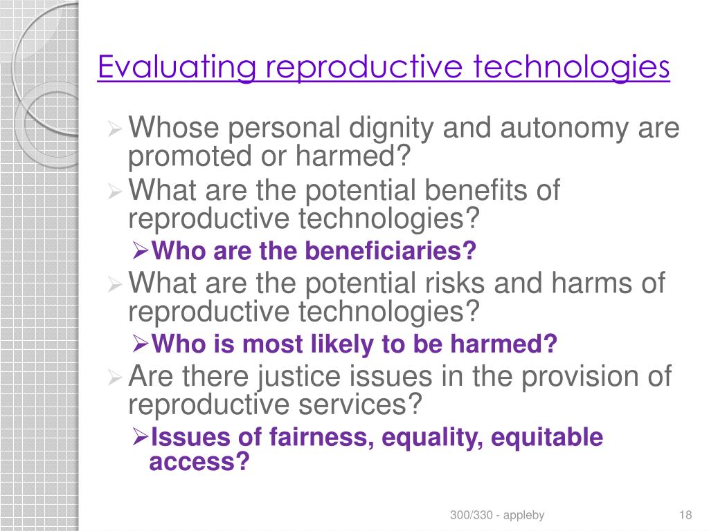 Evaluating reproductive technologies • Whose personal dignity and autonomy are promoted or harmed? • What are the potential benefits of reproductive technologies? • Who are the beneficiaries? • What are the potential risks and harms of reproductive technologies? • Who is most likely to be harmed? • Are there justice issues in the provision of reproductive services? • Issues of fairness, equality, equitable access? 300/330 - appleby