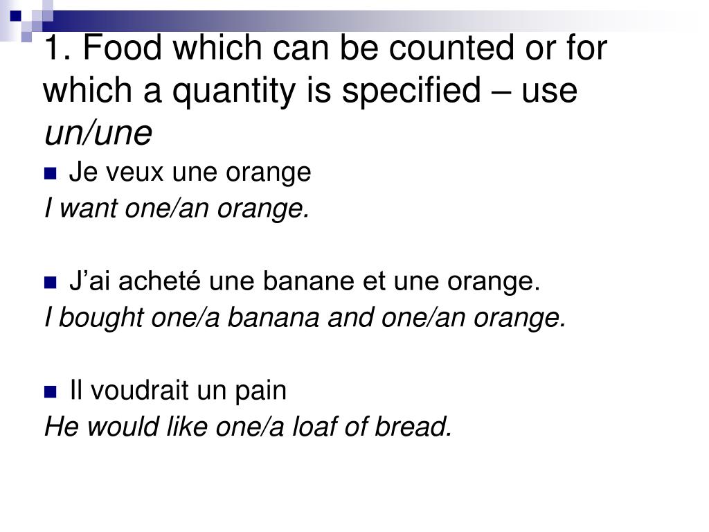1. Food which can be counted or for which a quantity is specified – use un/une • Je veux une orange I want one/an orange. • J’ai acheté une banane et une orange. I bought one/a banana and one/an orange. • Il voudrait un pain He would like one/a loaf of bread.