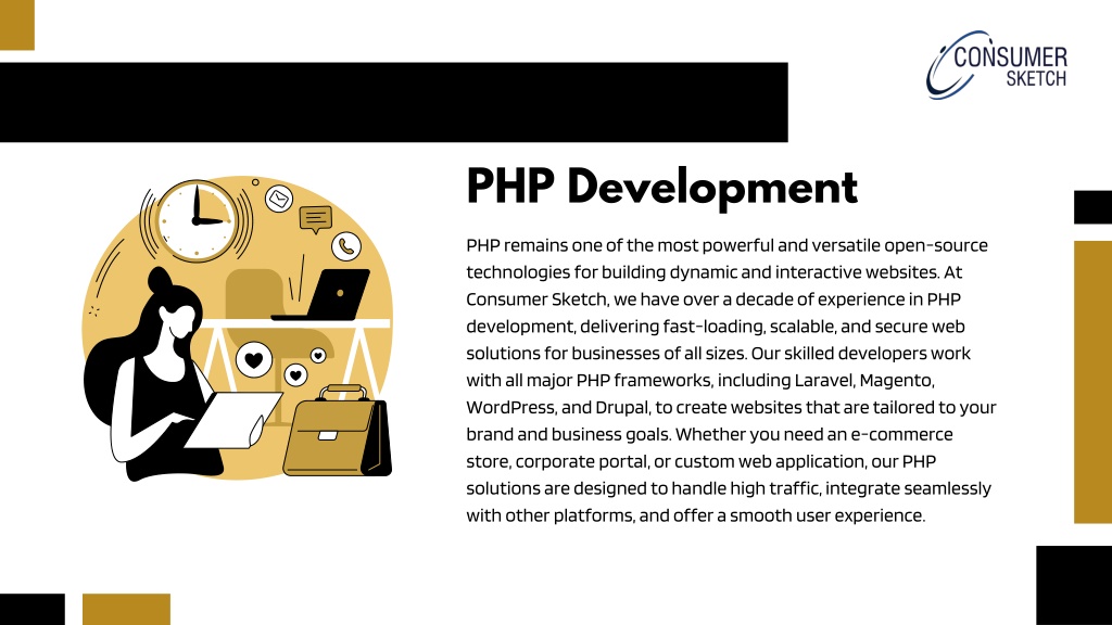 PHP Development PHP remains one of the most powerful and versatile open-source technologies for building dynamic and interactive websites. At Consumer Sketch, we have over a decade of experience in PHP development, delivering fast-loading, scalable, and secure web solutions for businesses of all sizes. Our skilled developers work with all major PHP frameworks, including Laravel, Magento, WordPress, and Drupal, to create websites that are tailored to your brand and business goals. Whether you need an e-commerce store, corporate portal, or custom web application, our PHP solutions are designed to handle high traffic, integrate seamlessly with other platforms, and offer a smooth user experience.