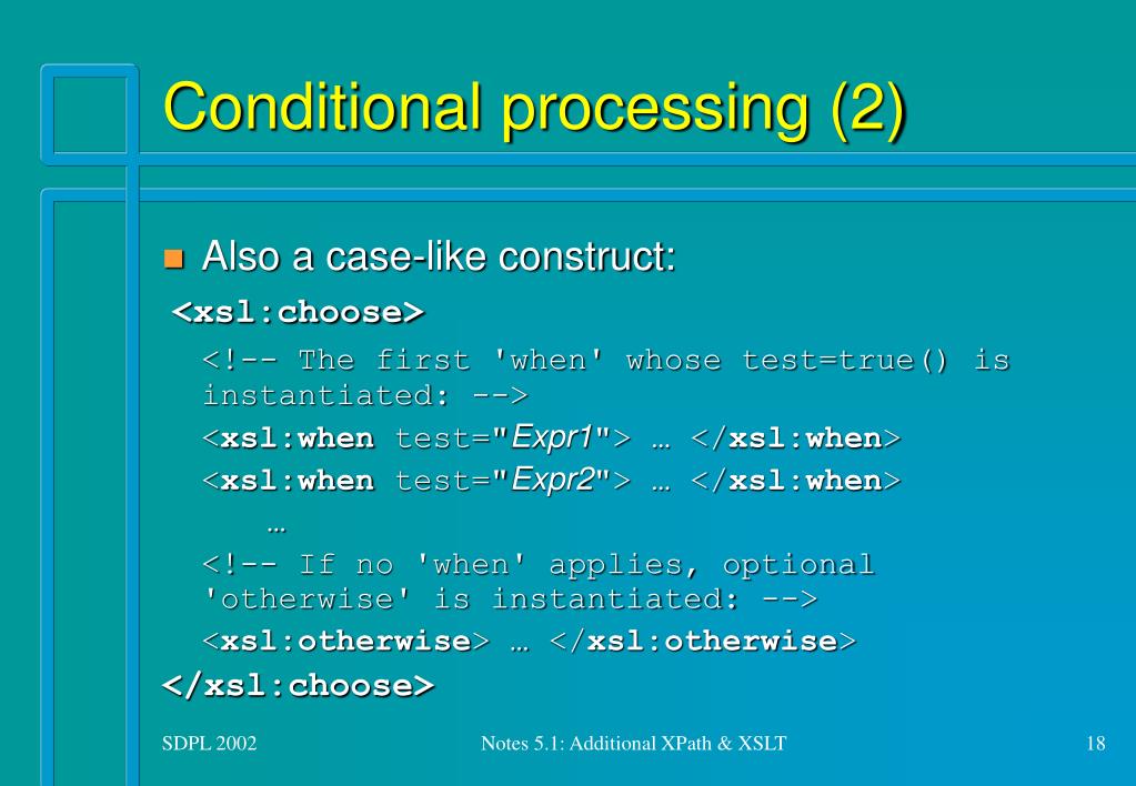 Conditional processing • A template can be instantiated or ignored based on the value of a testBoolean expression, using <xsl:if test="Expression">Template </xsl:if> • Example: a comma-separated list of names: <xsl:template match="namelist/name"> <xsl:apply-templates/> <xsl:if test="not(position()=last())" >, </xsl:if></xsl:template> Notes 5.1: Additional XPath & XSLT