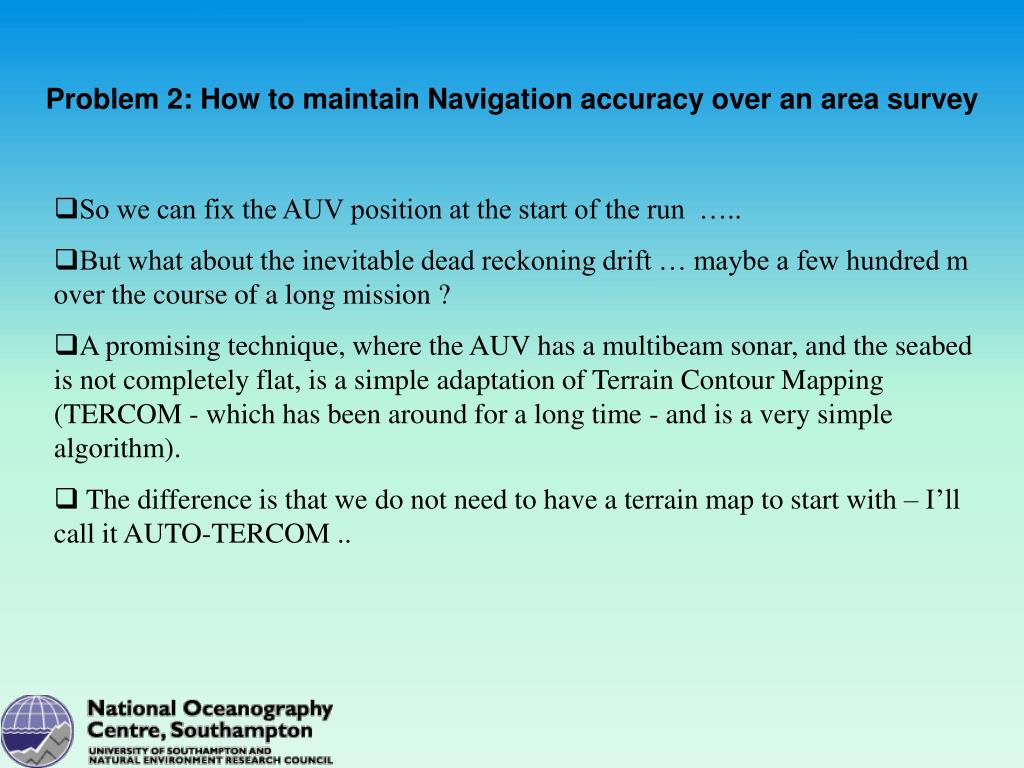Problem 2: How to maintain Navigation accuracy over an area survey • So we can fix the AUV position at the start of the run ….. • But what about the inevitable dead reckoning drift … maybe a few hundred m over the course of a long mission ? • A promising technique, where the AUV has a multibeam sonar, and the seabed is not completely flat, is a simple adaptation of Terrain Contour Mapping (TERCOM - which has been around for a long time - and is a very simple algorithm). • The difference is that we do not need to have a terrain map to start with – I’ll call it AUTO-TERCOM ..