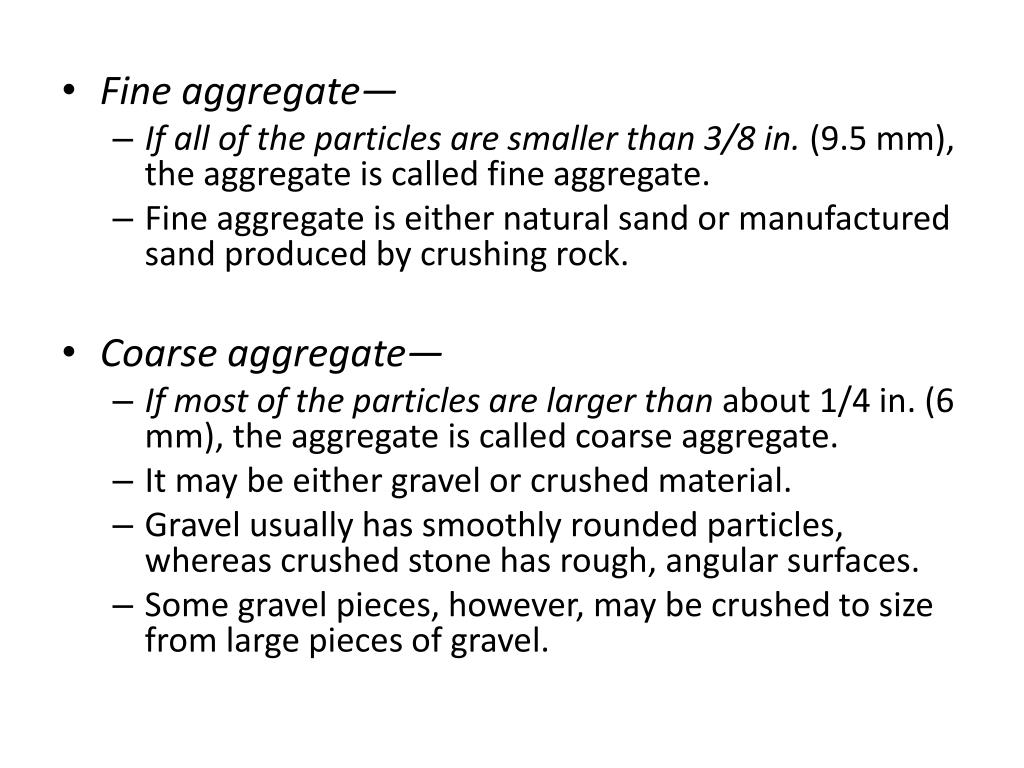 Fine aggregate— • If all of the particles are smaller than 3/8 in. (9.5 mm), the aggregate is called fine aggregate. • Fine aggregate is either natural sand or manufactured sand produced by crushing rock. • Coarse aggregate— • If most of the particles are larger than about 1/4 in. (6 mm), the aggregate is called coarse aggregate. • It may be either gravel or crushed material. • Gravel usually has smoothly rounded particles, whereas crushed stone has rough, angular surfaces. • Some gravel pieces, however, may be crushed to size from large pieces of gravel.
