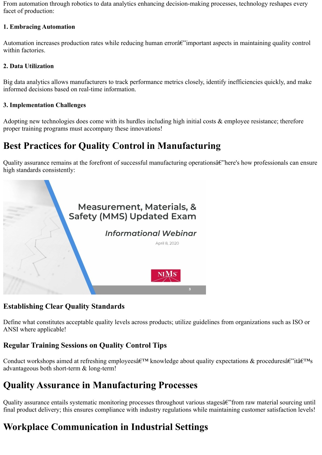 From automation through robotics to data analytics enhancing decision-making processes, technology reshapes every facet of production: 1. Embracing Automation Automation increases production rates while reducing human error—important aspects in maintaining quality control within factories. 2. Data Utilization Big data analytics allows manufacturers to track performance metrics closely, identify inefficiencies quickly, and make informed decisions based on real-time information. 3. Implementation Challenges Adopting new technologies does come with its hurdles including high initial costs & employee resistance; therefore proper training programs must accompany these innovations! Best Practices for Quality Control in Manufacturing Quality assurance remains at the forefront of successful manufacturing operations—here's how professionals can ensure high standards consistently: Establishing Clear Quality Standards Define what constitutes acceptable quality levels across products; utilize guidelines from organizations such as ISO or ANSI where applicable! Regular Training Sessions on Quality Control Tips Conduct workshops aimed at refreshing employees’ knowledge about quality expectations & procedures—it’s advantageous both short-term & long-term! Quality Assurance in Manufacturing Processes Quality assurance entails systematic monitoring processes throughout various stages—from raw material sourcing until final product delivery; this ensures compliance with industry regulations while maintaining customer satisfaction levels! Workplace Communication in Industrial Settings