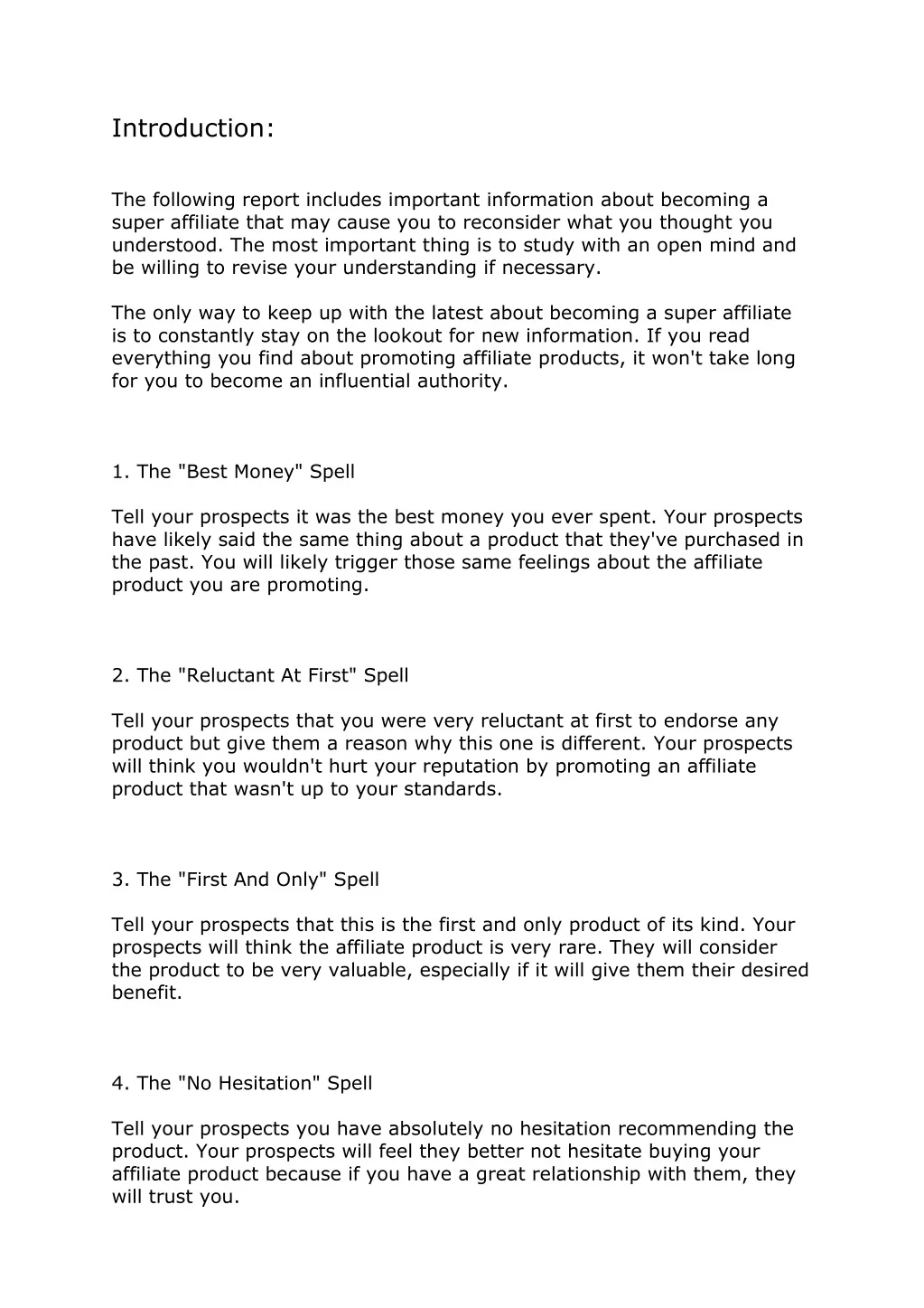 Introduction: The following report includes important information about becoming a super affiliate that may cause you to reconsider what you thought you understood. The most important thing is to study with an open mind and be willing to revise your understanding if necessary. The only way to keep up with the latest about becoming a super affiliate is to constantly stay on the lookout for new information. If you read everything you find about promoting affiliate products, it won't take long for you to become an influential authority. 1. The "Best Money" Spell Tell your prospects it was the best money you ever spent. Your prospects have likely said the same thing about a product that they've purchased in the past. You will likely trigger those same feelings about the affiliate product you are promoting. 2. The "Reluctant At First" Spell Tell your prospects that you were very reluctant at first to endorse any product but give them a reason why this one is different. Your prospects will think you wouldn't hurt your reputation by promoting an affiliate product that wasn't up to your standards. 3. The "First And Only" Spell Tell your prospects that this is the first and only product of its kind. Your prospects will think the affiliate product is very rare. They will consider the product to be very valuable, especially if it will give them their desired benefit. 4. The "No Hesitation" Spell Tell your prospects you have absolutely no hesitation recommending the product. Your prospects will feel they better not hesitate buying your affiliate product because if you have a great relationship with them, they will trust you.