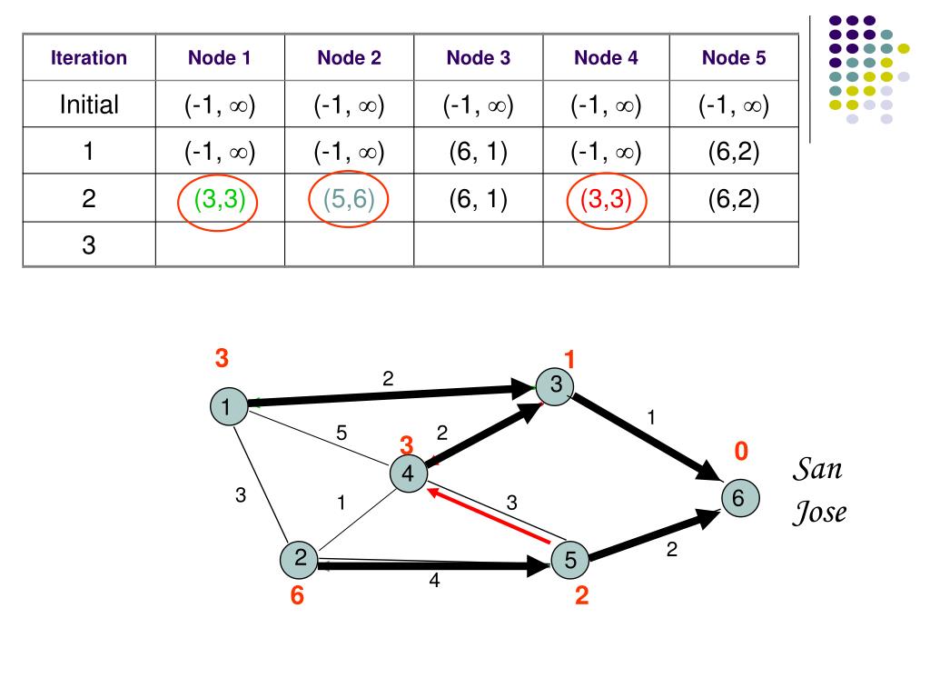 San Jose j' j i j" But we don’t know the shortest paths i only has local info from neighbors Dj' Cij' Dj Cij Pick current shortest path Cij” Di Dj"
