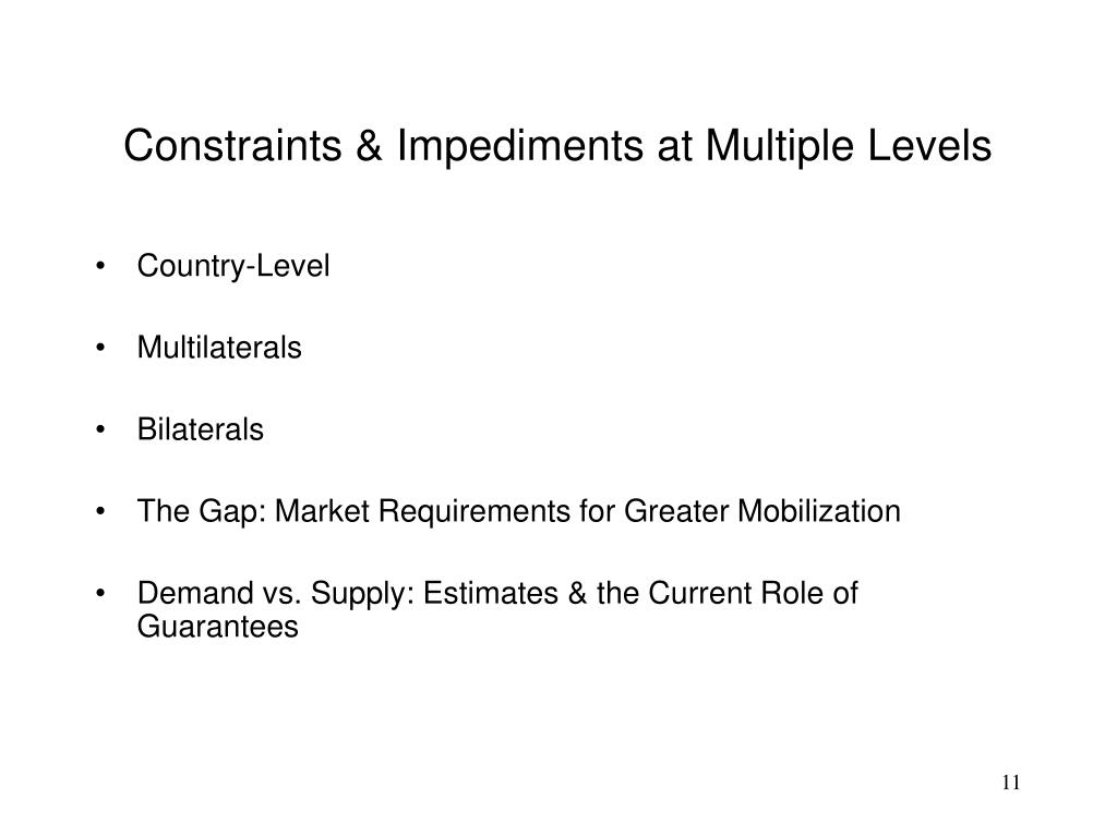 Constraints & Impediments at Multiple Levels • Country-Level • Multilaterals • Bilaterals • The Gap: Market Requirements for Greater Mobilization • Demand vs. Supply: Estimates & the Current Role of Guarantees