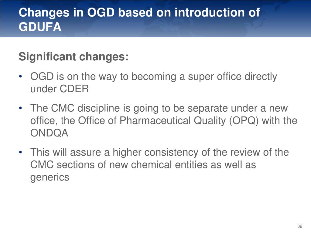 Changes in OGD based on introduction of GDUFA Significant changes: • OGD is on the way to becoming a super office directly under CDER • The CMC discipline is going to be separate under a new office, the Office of Pharmaceutical Quality (OPQ) with the ONDQA • This will assure a higher consistency of the review of the CMC sections of new chemical entities as well as generics