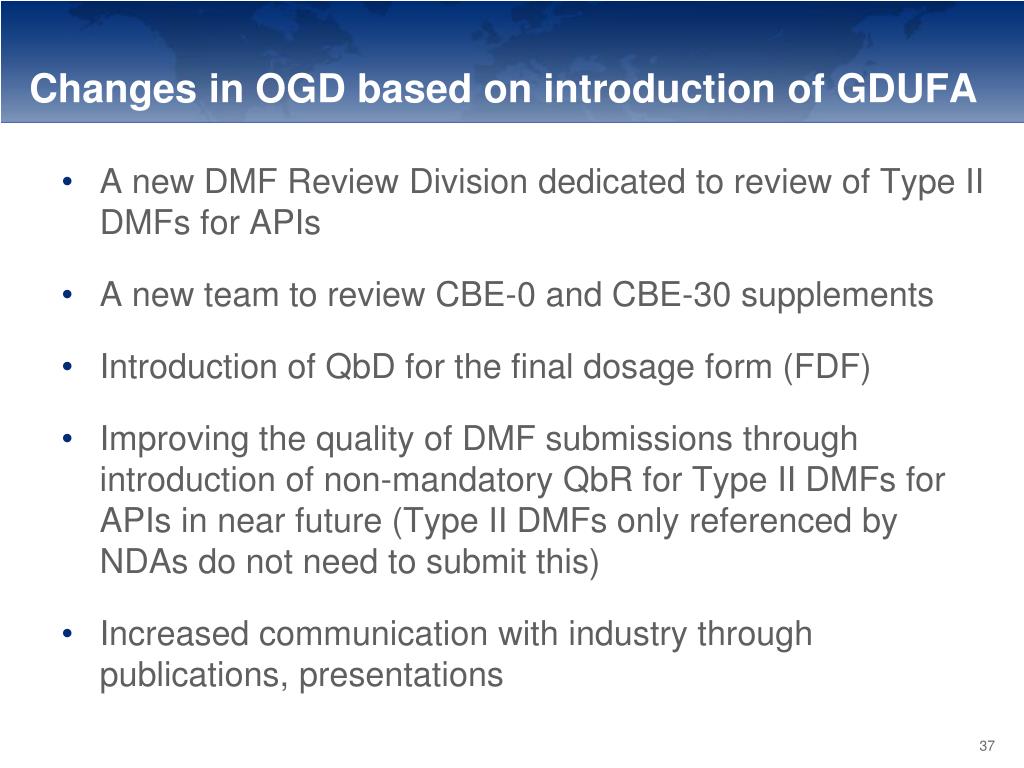 Changes in OGD based on introduction of GDUFA • A new DMF Review Division dedicated to review of Type II DMFs for APIs • A new team to review CBE-0 and CBE-30 supplements • Introduction of QbD for the final dosage form (FDF) • Improving the quality of DMF submissions through introduction of non-mandatory QbR for Type II DMFs for APIs in near future (Type II DMFs only referenced by NDAs do not need to submit this) • Increased communication with industry through publications, presentations